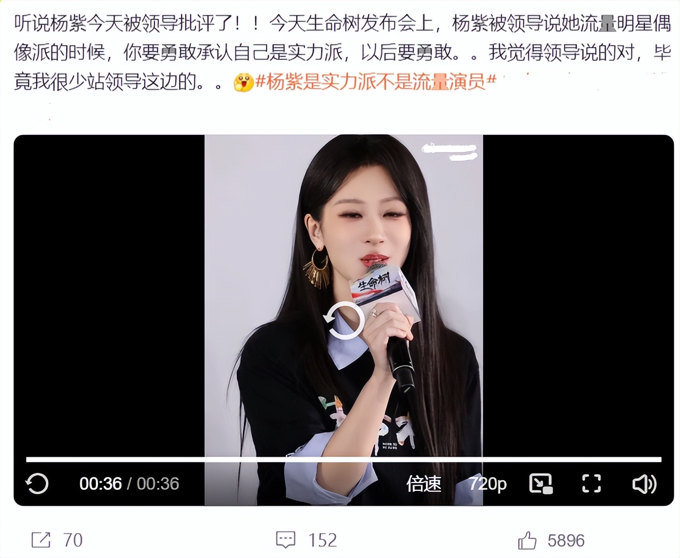 《生命树》开播前,官方举办发布会,主演们全员出席,但让大家没想到的是,杨紫竟被领导给批评了。在发布会现场,有位领导对杨紫说:如果有人说你是偶像派的时候,你要勇于承认自己是实力派,以后要勇敢。