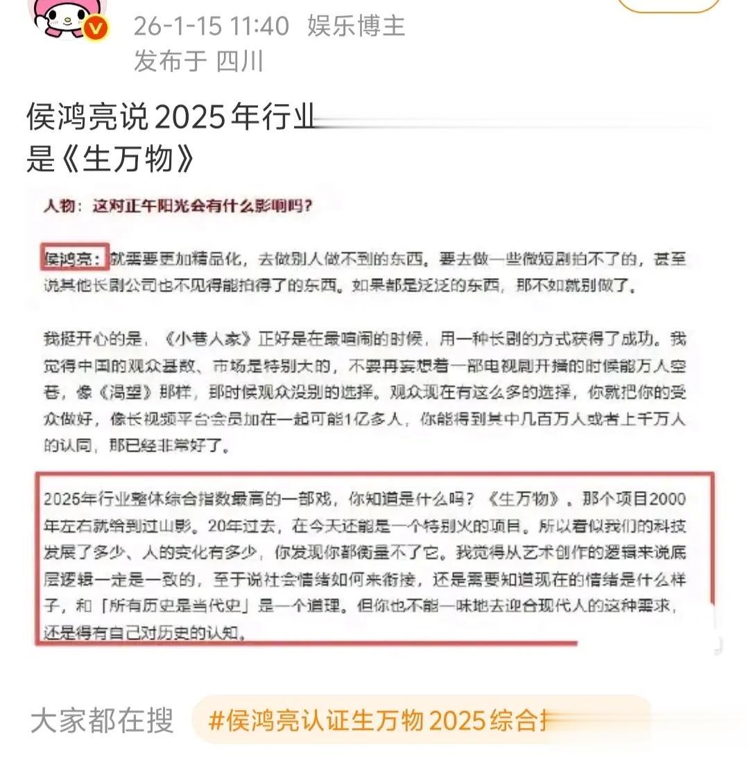 同样是在这天,正午阳光老板侯鸿亮最新采访出炉,作为业内的他,直言2025年行业整体综合指数最高的剧是《生万物》。