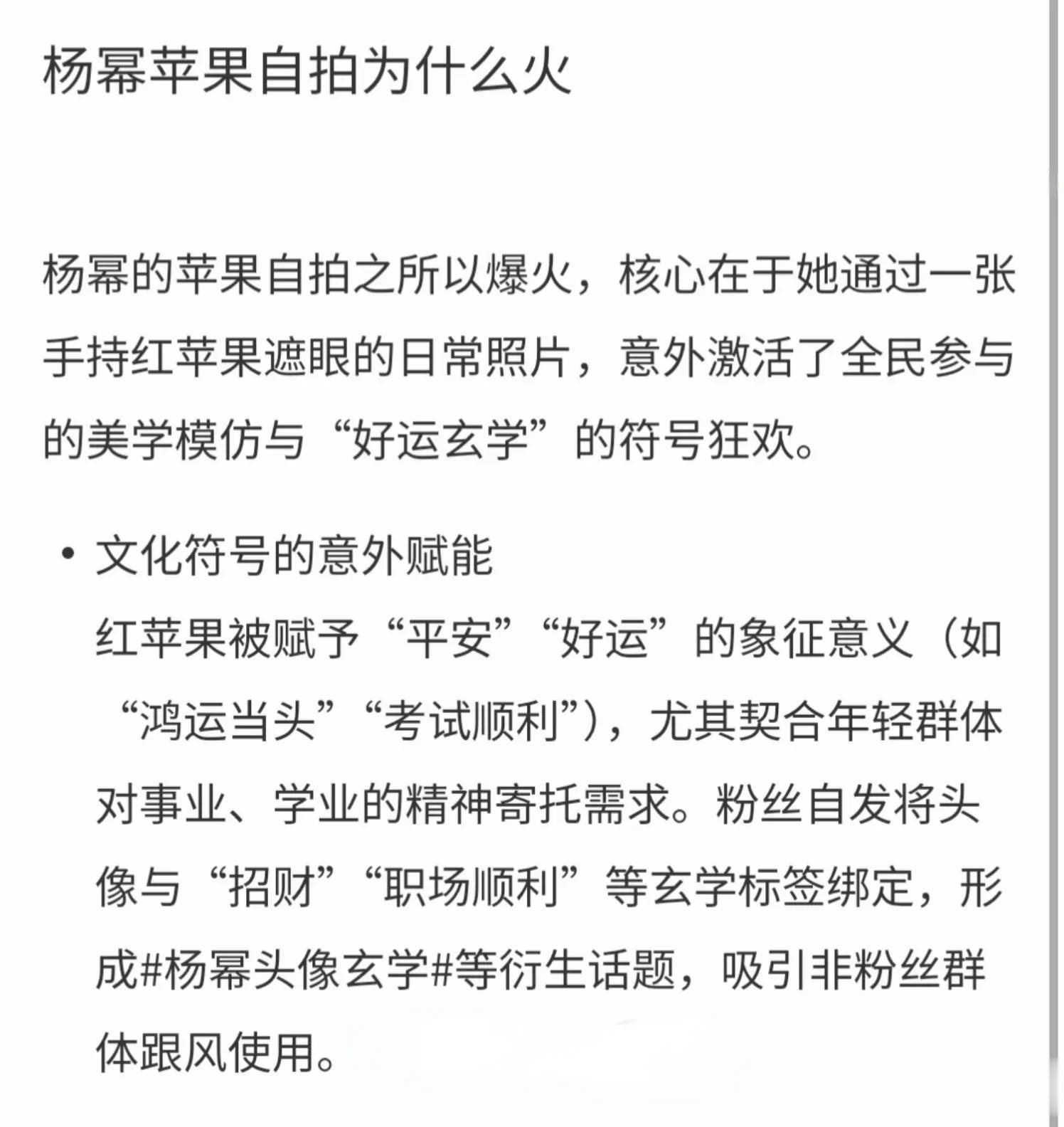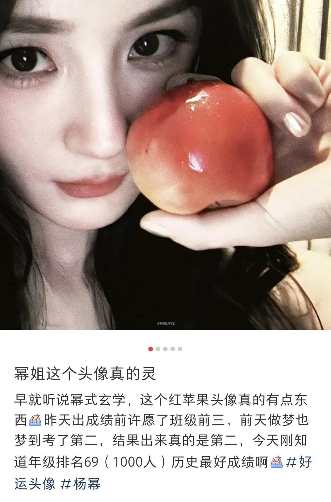 神奇的是,杨幂的苹果“好运玄学”应验在了她自己身上,逆天改命就此上演。2025年3月,杨幂在ins上发布了一则手拿苹果的自拍图。