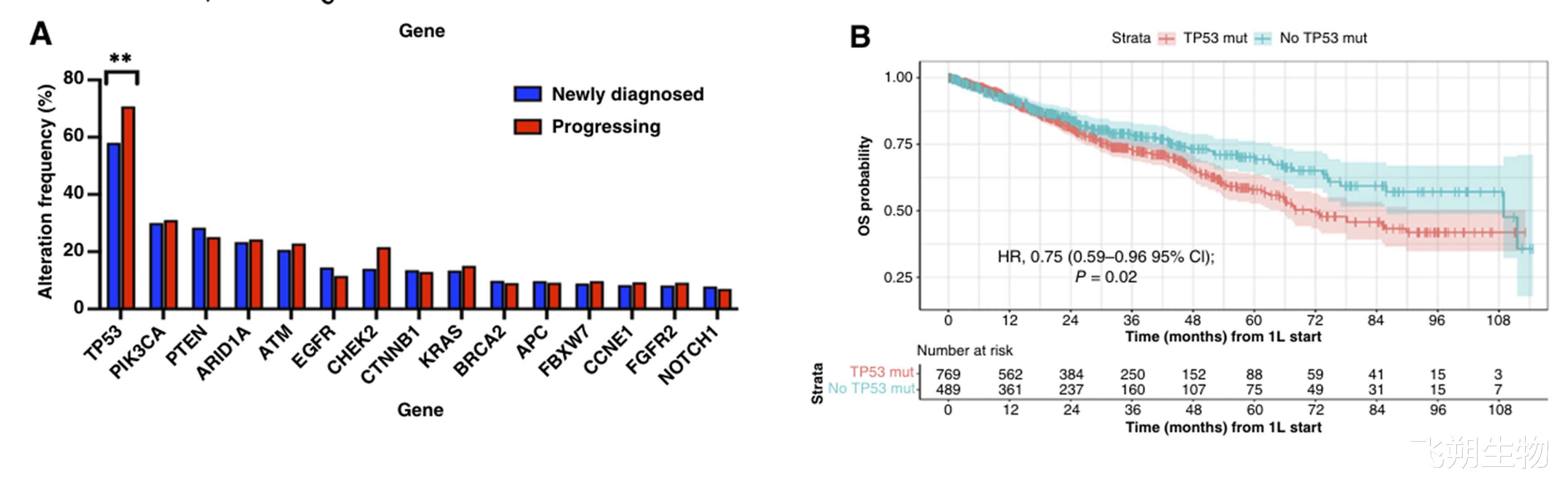 图2. A,TP53基因突变更显著分布在复发进展患者中;B,TP53突变与较低总生存期有关