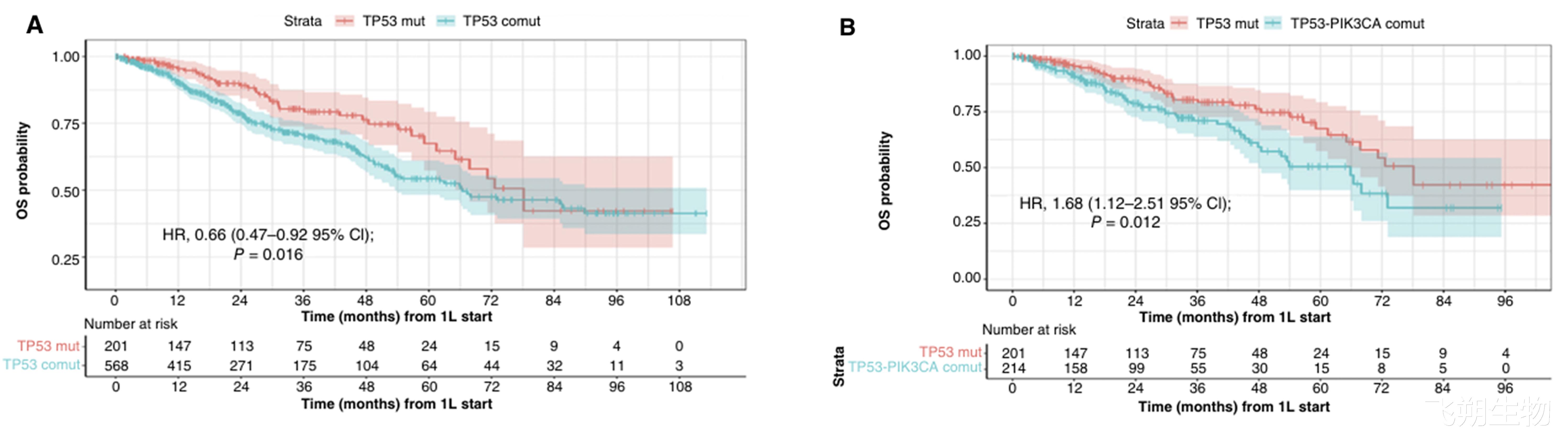 研究发现 TP53 共突变状态对患者预后的影响更为显著。在 776 例 TP53 突变患者中,74%存在至少一种共突变,这类患者的总生存期(66.4 个月)明显差于仅发生 TP53 单一突变的患者(78.1 个月,P=0.016)。其中,TP53 与PIK3CA 共突变(P=0.012)的患者预后最差,成为临床需要重点关注的高危人群。