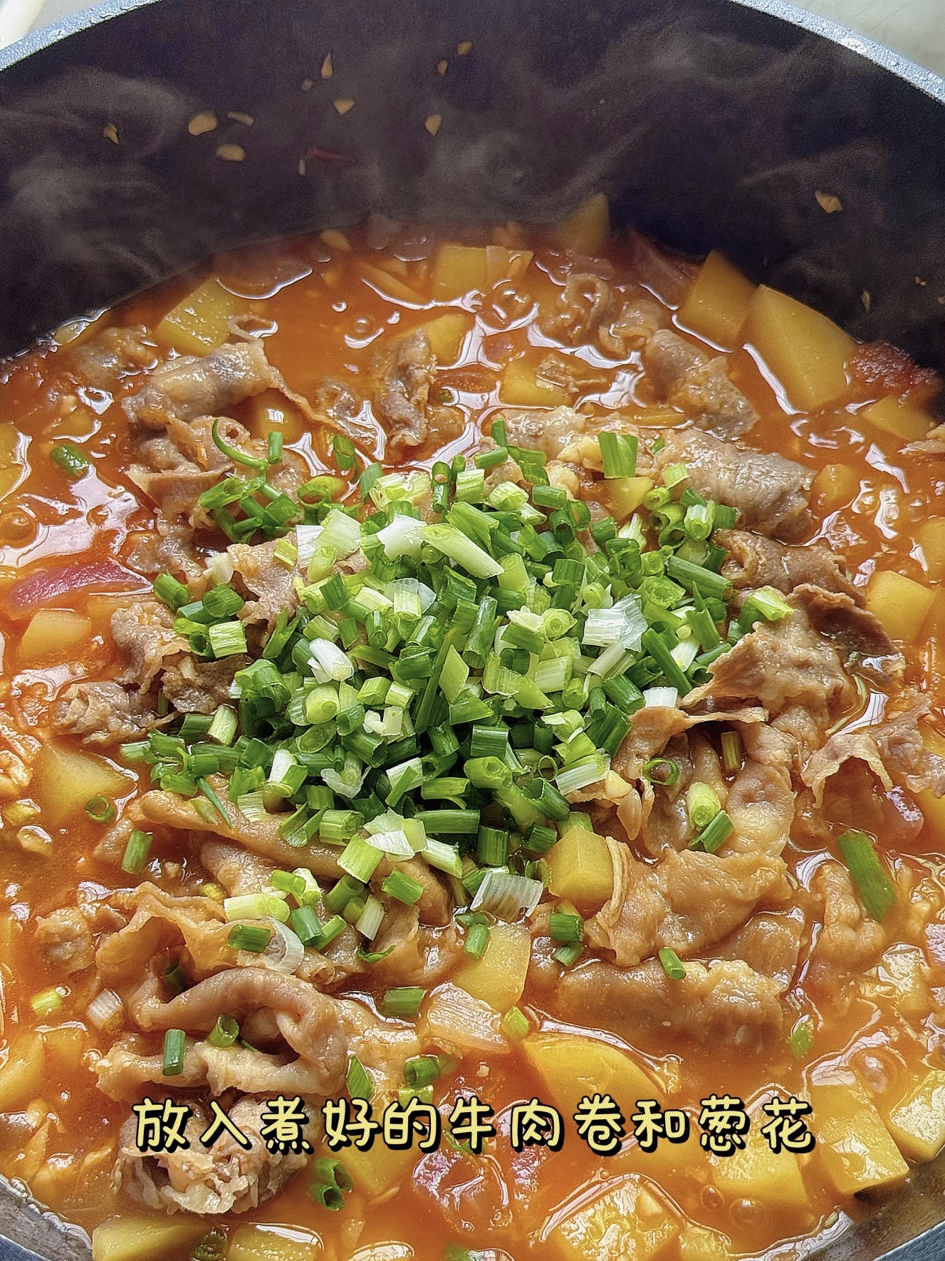 成品登场:汤色奶白透红,挂着晶亮酱汁;土豆块金黄软糯,像一颗颗“小金砖”;肥牛卷粉嫩微卷,点缀其间;葱花绿得晃眼,像给“金色小弹”点了“森林星光”。先来一口汤——鲜、热、酸、滑,四层味觉依次炸开;再咬一块土豆——外层吸满番茄酸,内里绵到像豆沙;再嚼肥牛卷,外层吸满酱香,内里嫩到像豆花,配一口米饭,汤汁渗进米粒,不知不觉碗底朝天;空口吃也过瘾,酸鲜开胃,筷子根本停不下来。