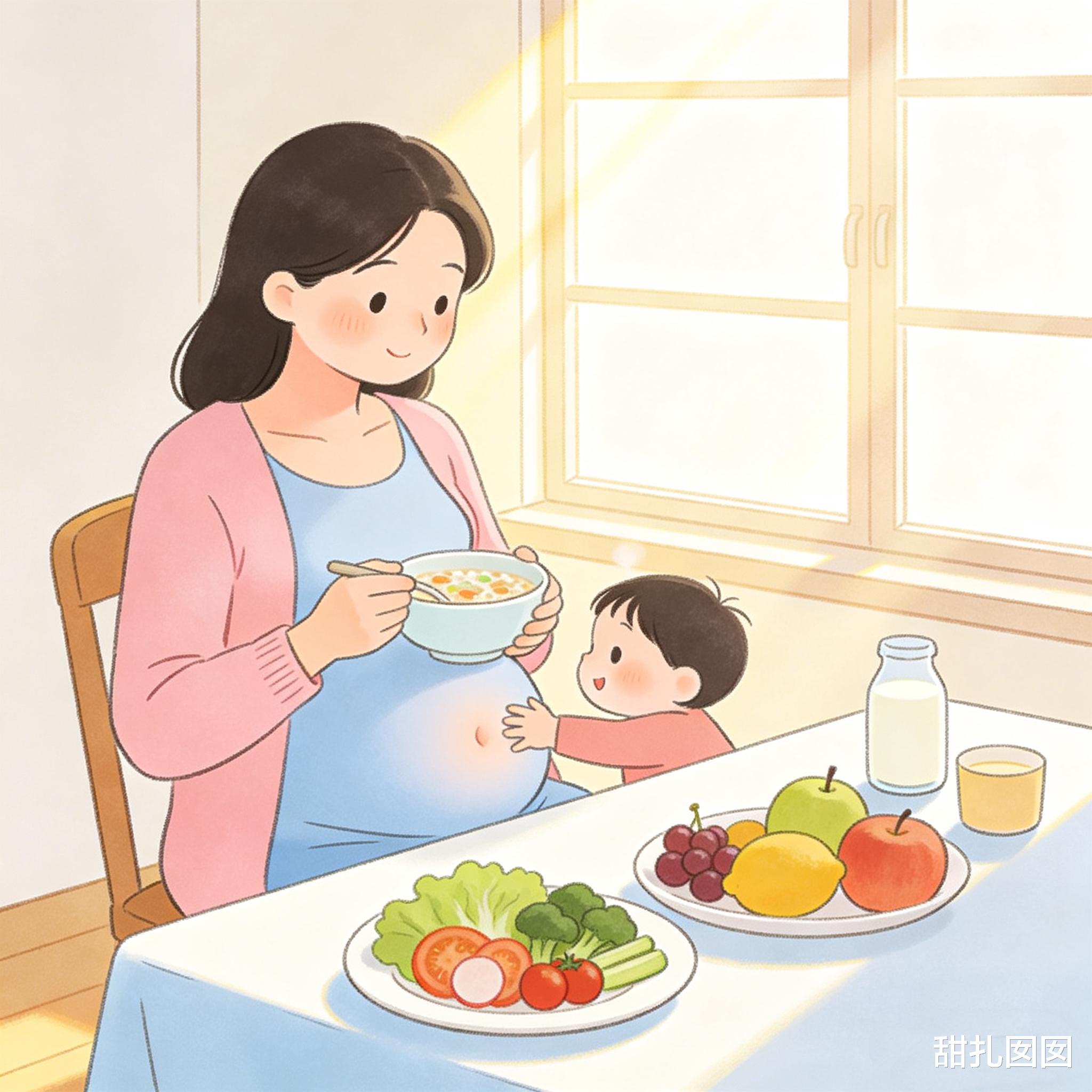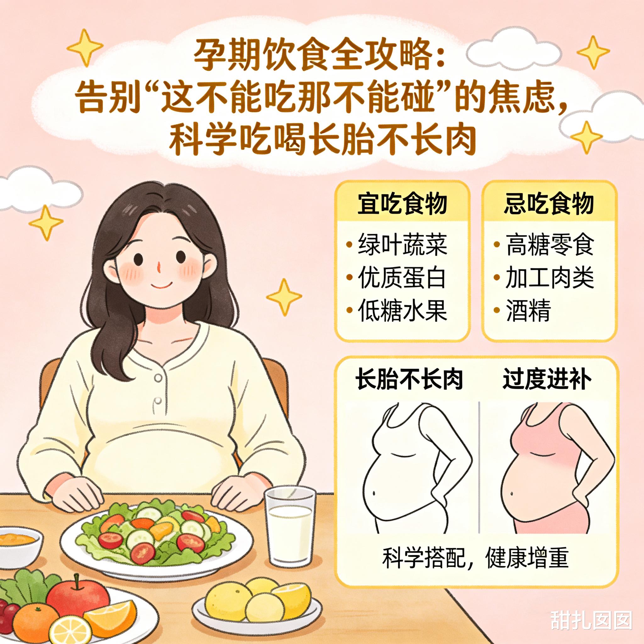 误区纠正:"一人吃两人份"——错,孕早期能量需求几乎不变,中晚期每天只多300-450大卡(约1杯牛奶+1个鸡蛋)。过度增重增加妊娠糖尿病、巨大儿、难产风险。