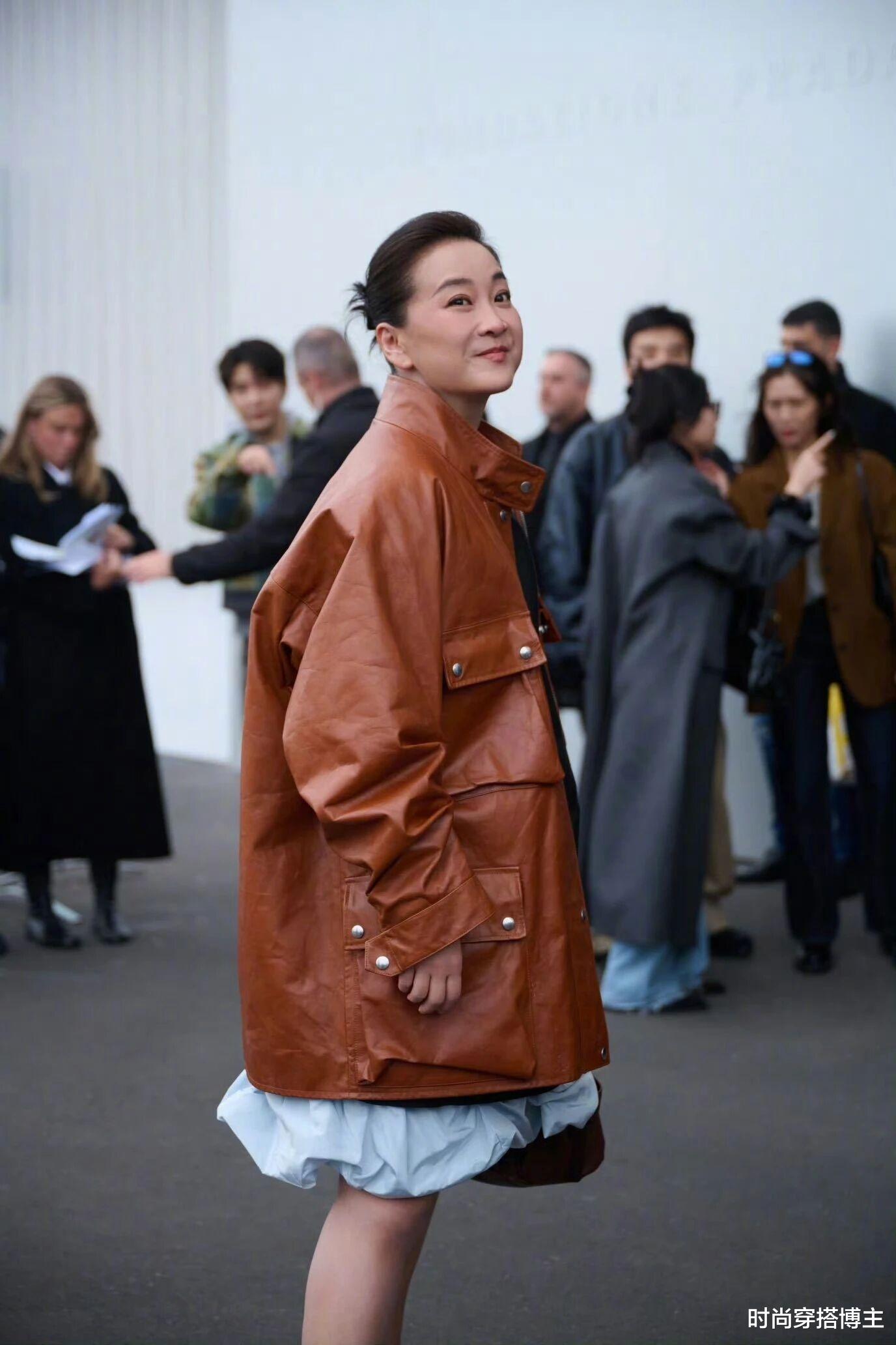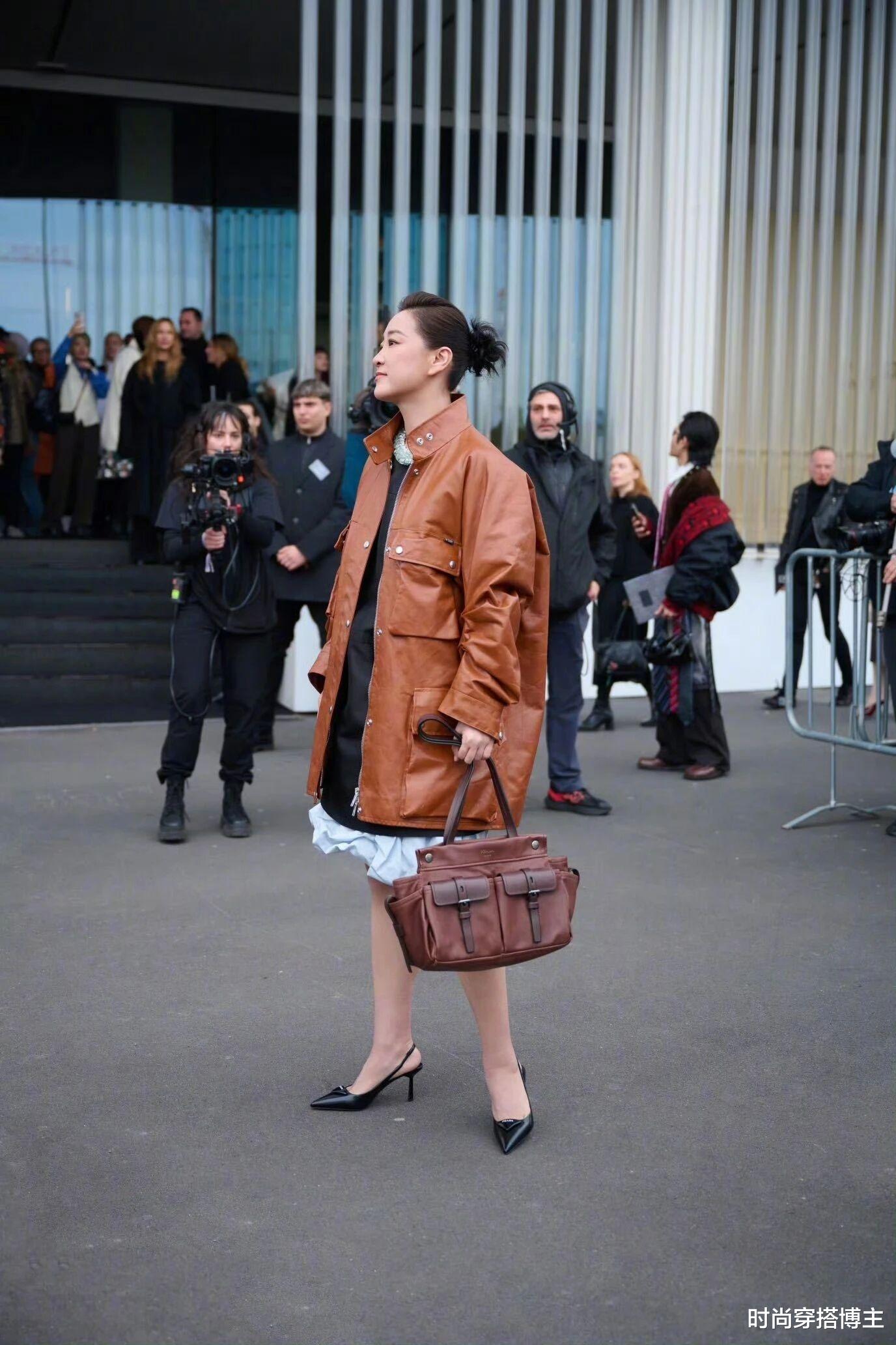 只见她穿着一身宽大的棕色皮衣配连衣短裙,头发也梳了个大背头一股脑扎了起来,看起来就很飒。