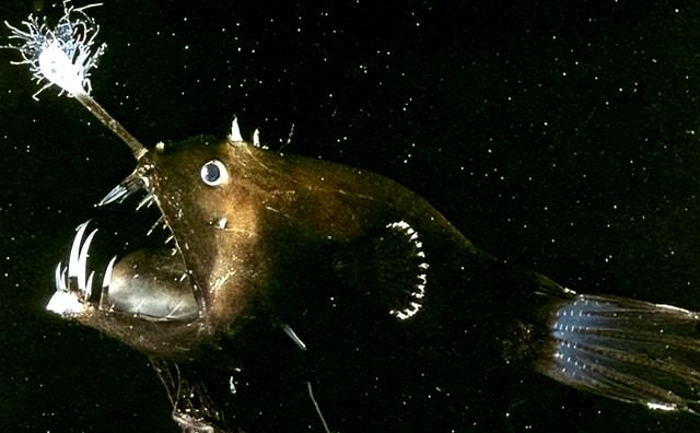 其头部有一个会发光的肉状小突起,这个突起并非用于照明,而是用来吸引其他鱼类,以实现捕食的目的。鮟鱇鱼的嘴巴异常宽大,布满尖锐的牙齿,似乎能够轻易地将猎物一口吞下。