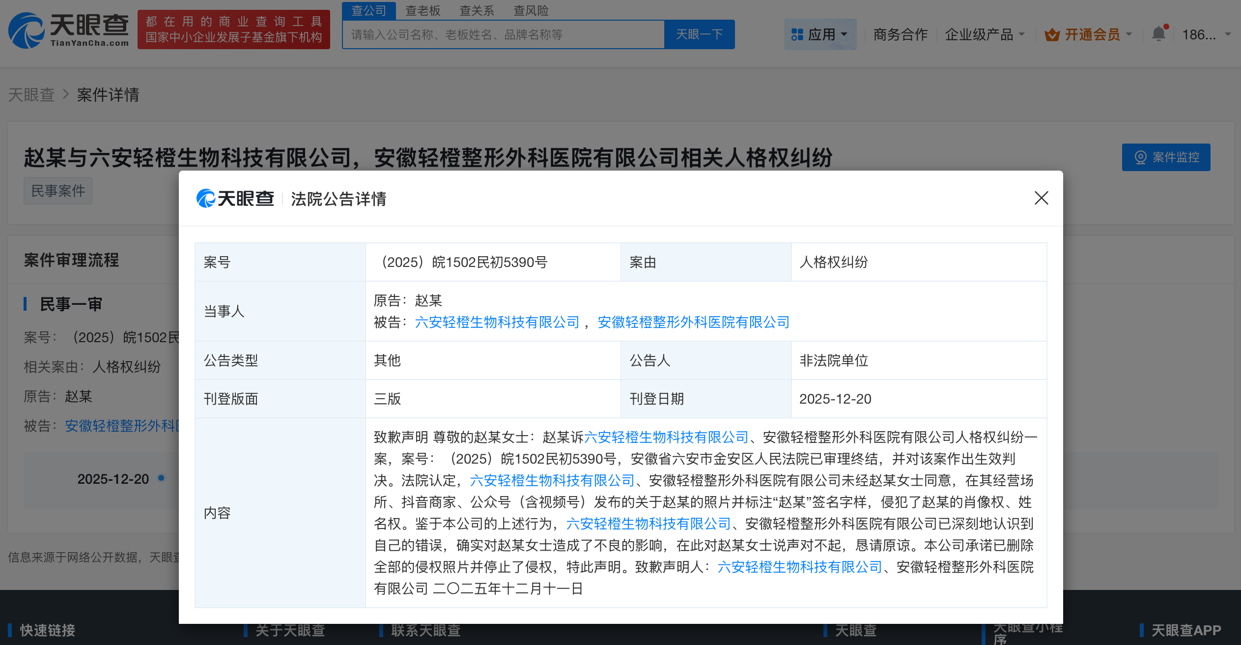 天眼查法律诉讼信息显示,近日,法院公开六安轻橙生物科技有限公司、安徽轻橙整形外科医院有限公司向赵丽颖的致歉声明。内容显示