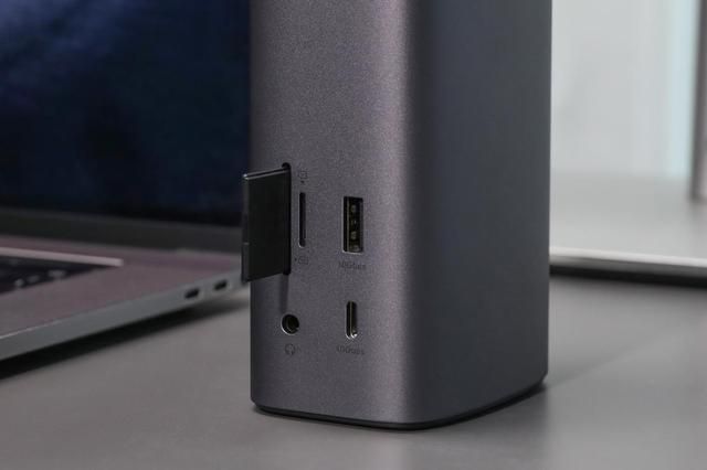 不仅如此,这款扩展坞还将比较常用的SD/TF读卡槽、高速数据接口以及3.5mm音频口,放在了扩展坞的正面,诸如供电口、网线接口、视频输出端口等插拔不频繁的接口,则放在了扩展坞的背面。这样的设计,也让桌面理线更加清爽,堪称强迫症福音。