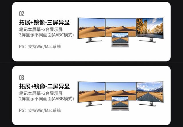 此外,扩展坞还支持另外两种扩展+复制的模式,分别是三屏异显以及二屏异显,Mac/Win系统均支持以下两种模式: