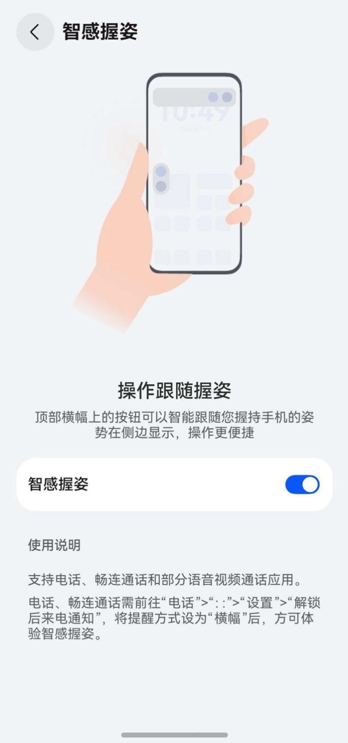 我寻思着光说没用,得让他实际体验一下才行。正好我手里有台华为Pura 80 Pro,我和他说:“你不是担心单手接电话、用手机不方便吗?这手机里有个智感握姿功能,能认出你用哪只手拿手机,接电话的按键会自己跑到你手边,不用费劲去够。”