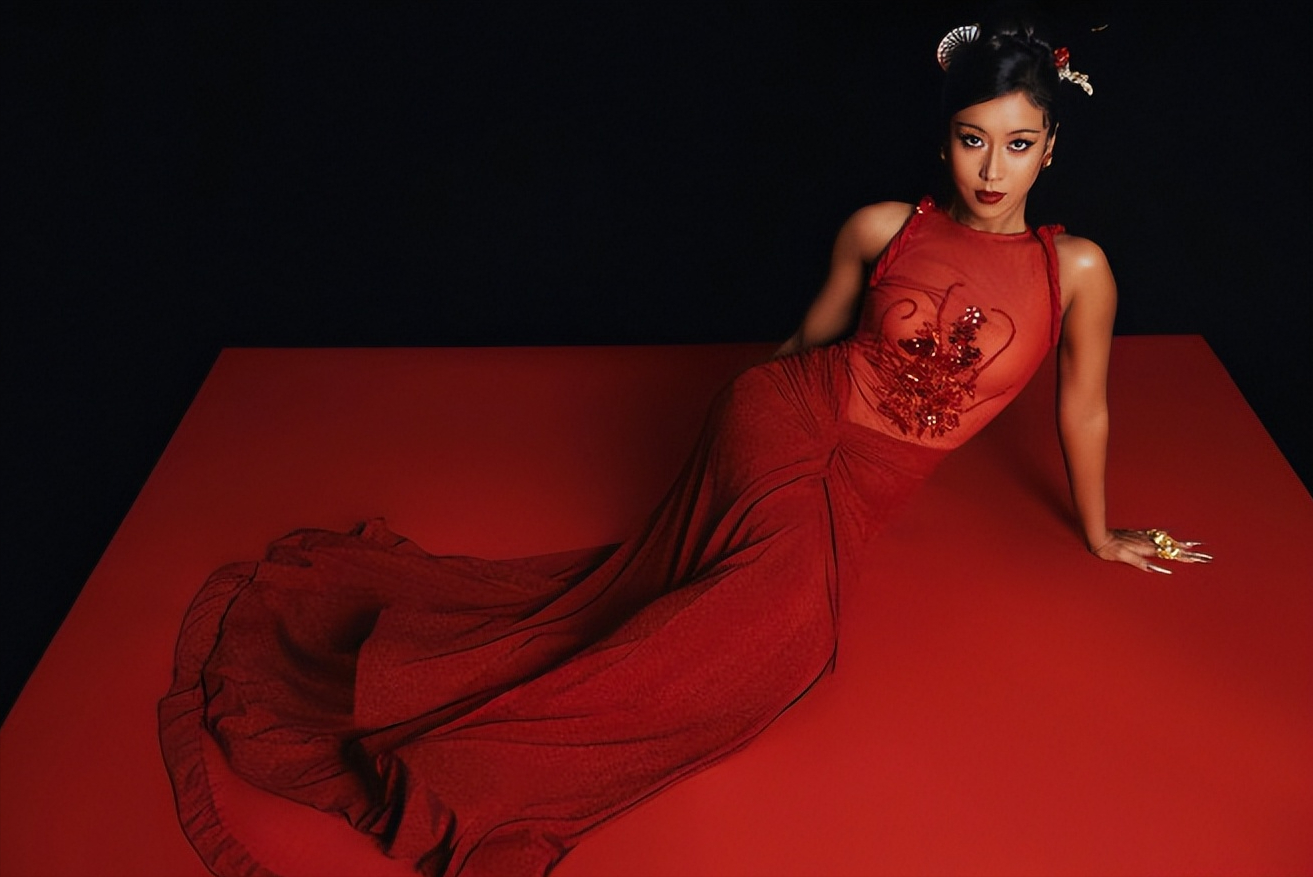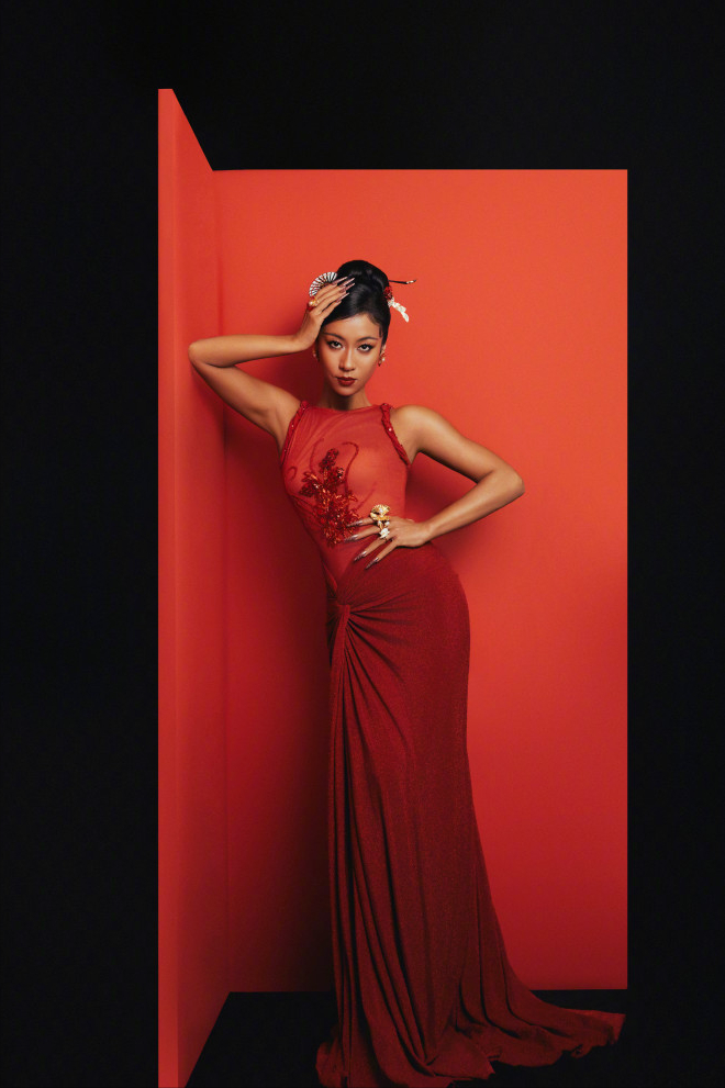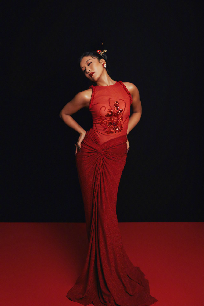 从照片中可以看到,她身穿一袭紧身红色长裙,裙身点缀着精致的刺绣和亮片装饰,搭配干练的发髻和富有东方韵味的配饰,整个人散发出极具感染力的气场。