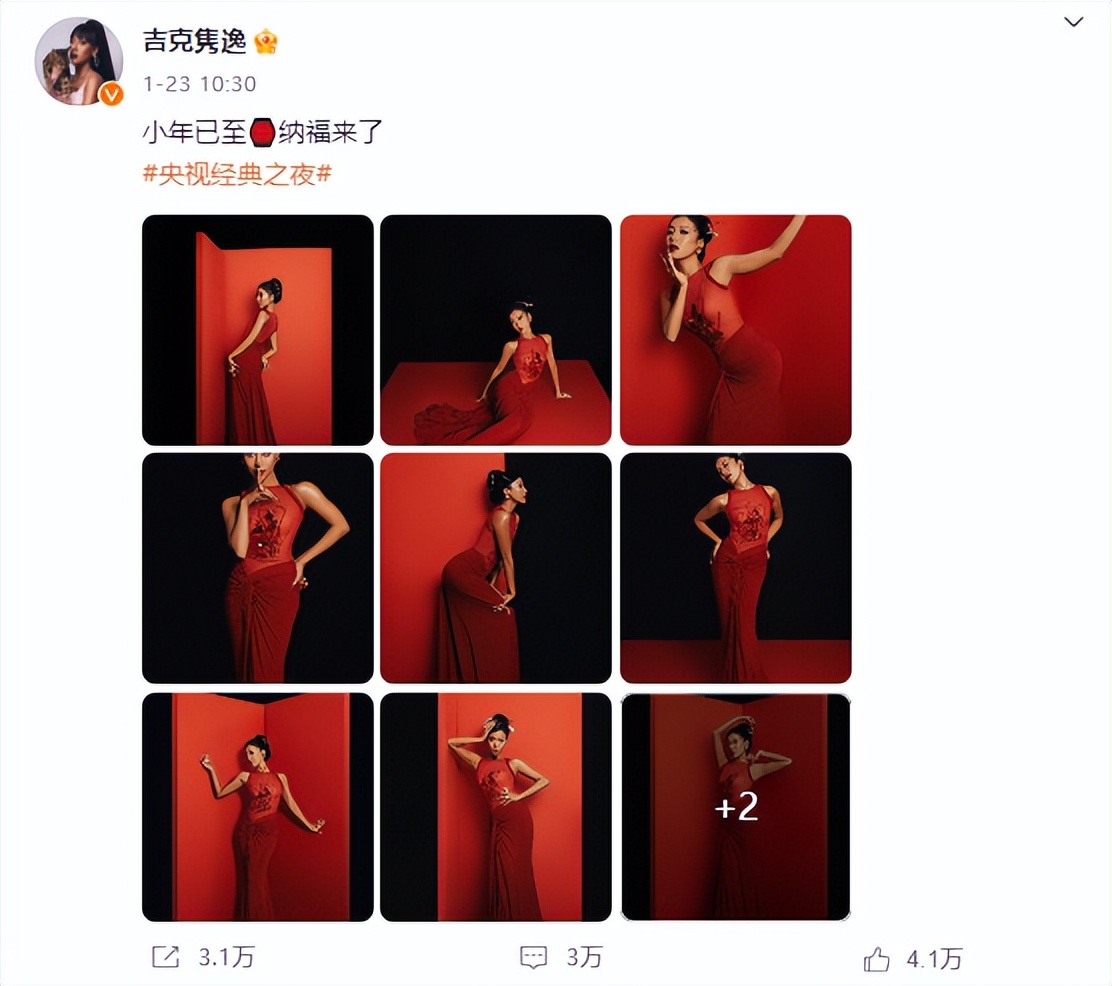 1月23日,吉克隽逸在微博发布了一组红色主题写真,并配文“小年已至,纳福来了”,瞬间引发热议。