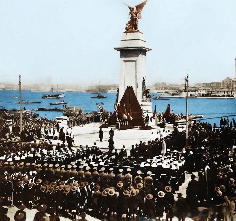 1924年2月16日,上海欧战纪念碑揭幕仪式,黄浦江边的广场上,高耸的纪念碑矗立中央,顶部和平女神铜像暂覆幕布,近万人群挤满场地——前排是整齐列队的万国商团军乐队、制服仪仗队,周围是西装礼帽的侨民、中外官员,各国旗帜竖立两侧,江面上的船只与军舰也参与了这场仪式,军乐、人群欢呼与江上汽笛声交织,透着当时上海租界的特殊公共氛围。