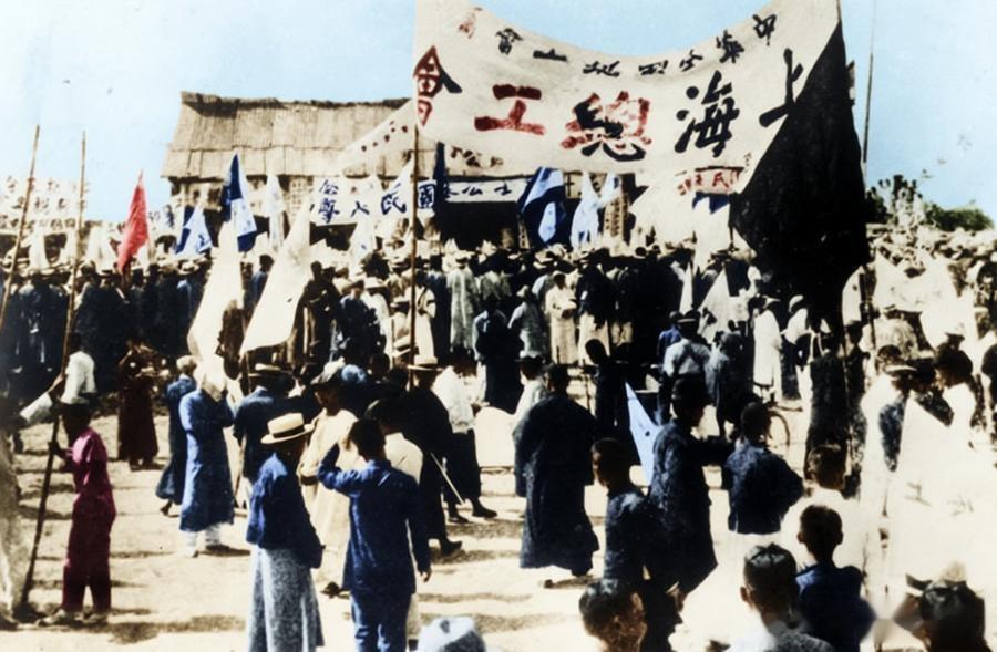 1925年,五卅运动,上海总工会领导下的工人游行队伍,它是中国近代史上第一次大规模、由工人阶级作为主力军的反帝爱国运动高潮时刻。