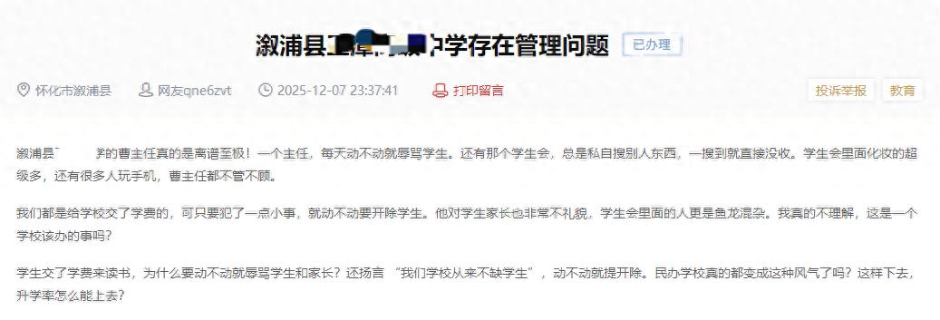 近日,有网友在红网“百姓呼声”栏目上留言,反映怀化溆浦某高中存在管理问题,引发热议。