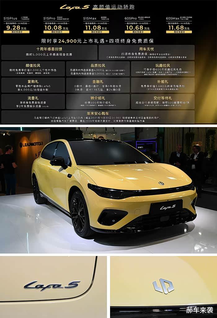 2025年11月底,零跑全新纯电动两厢紧凑型轿车—零跑Lafa5正式上市,新车共推出五款车型,售价区间为9.78万~12.18万元。与此同时,现在购车还可享受价值24900元上市礼包+四项终身免费质保,包括限时现金优惠5000元、赠送价值2000元个性配色、价值4000元内饰选装基金以及价值4000元增换购补贴等等,那么新车还有哪些亮点呢?