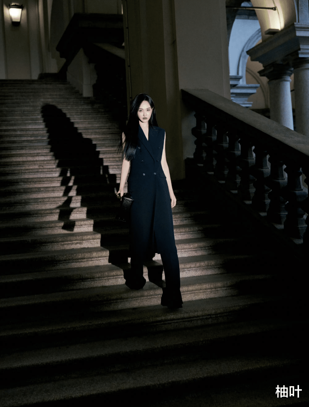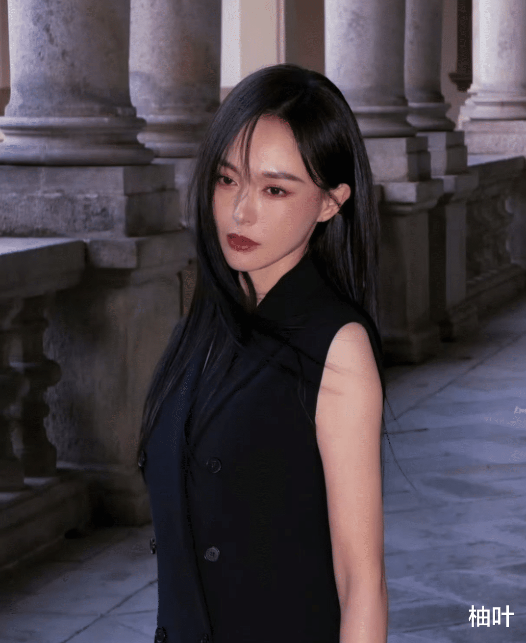 这垂坠面料,就像被施了魔法一样,紧紧贴合着她的身形,仿佛是她身体的一部分,流畅又自然。利落的剪裁,把她的肩颈线条勾勒得如同艺术品一般,精致又迷人。再搭配上那黑长直发型和哑光红唇,整个人就像从时尚杂志封面里走出来的女王,气场强大到能瞬间“秒杀”全场。
