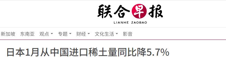 话音刚落,媒体就公布了一则高市不想看到的消息,日本今年1月从中国进口的稀土数量同比减少5.7%。