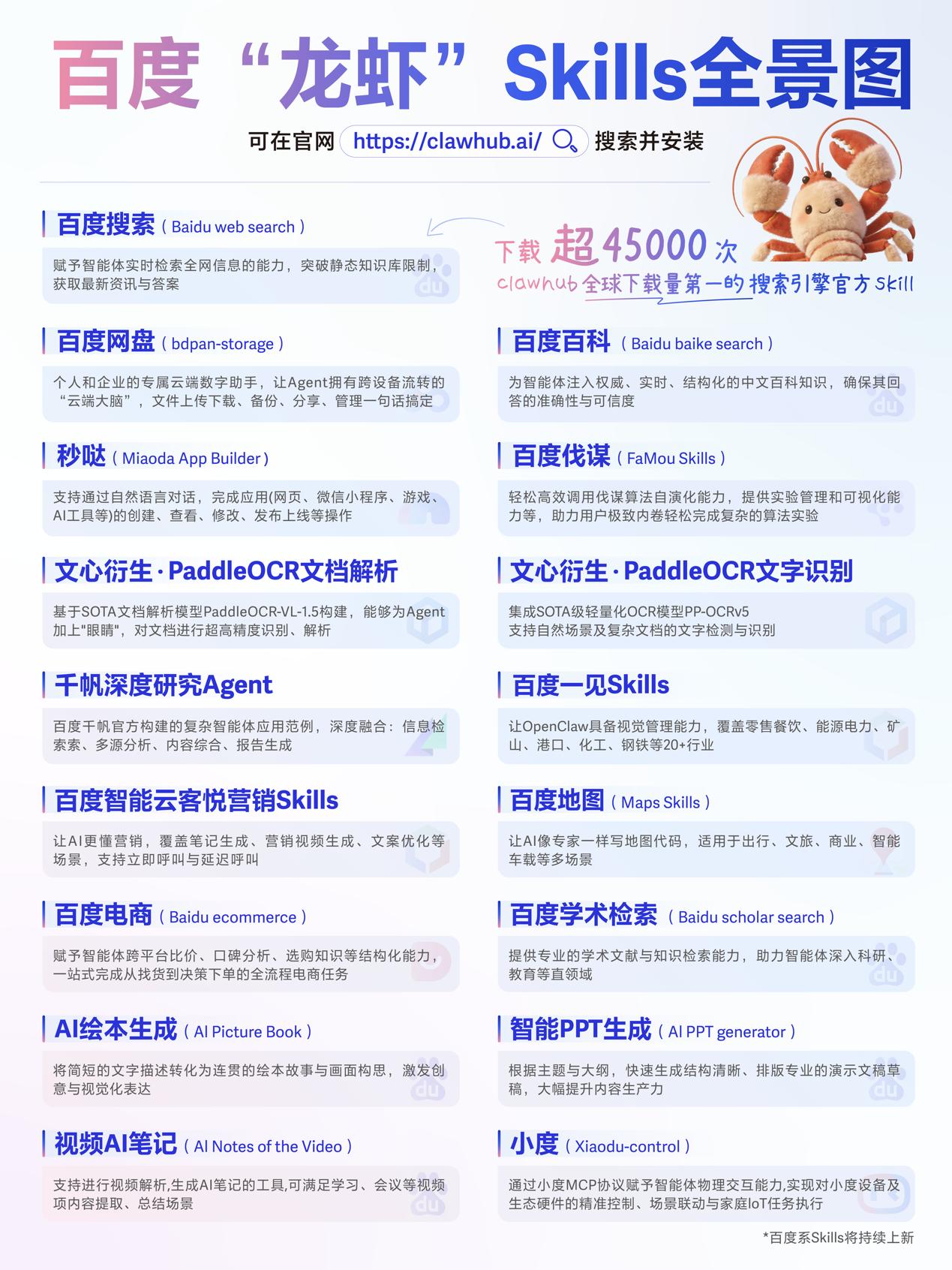 本次,百度透露了其对多项龙虾工具类的布局进展,推动布局涵盖云边端的同时,还丰富了百度官方skills库。