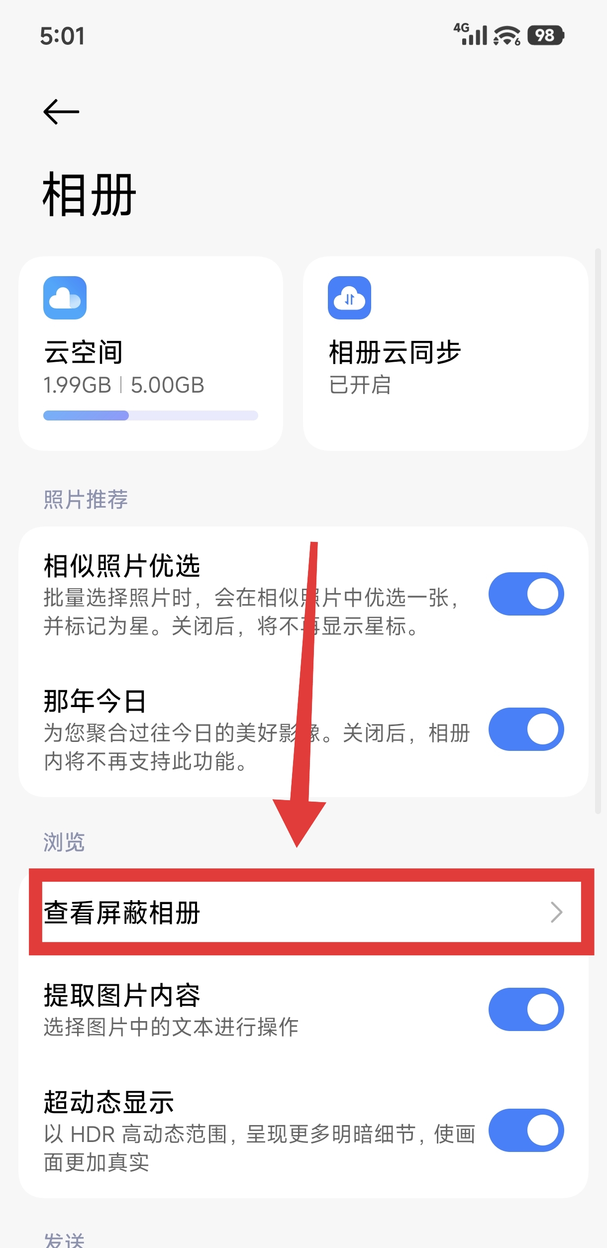 4.最后进入到相册设置页面后,点击【查看屏蔽相册】即可查看隐藏图片了。
