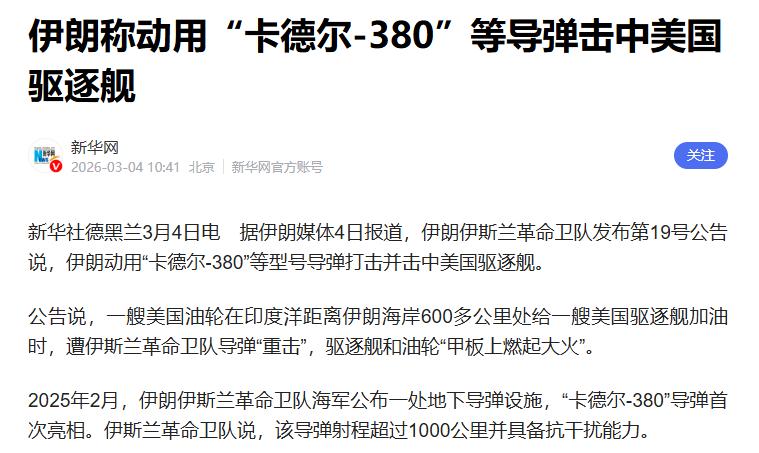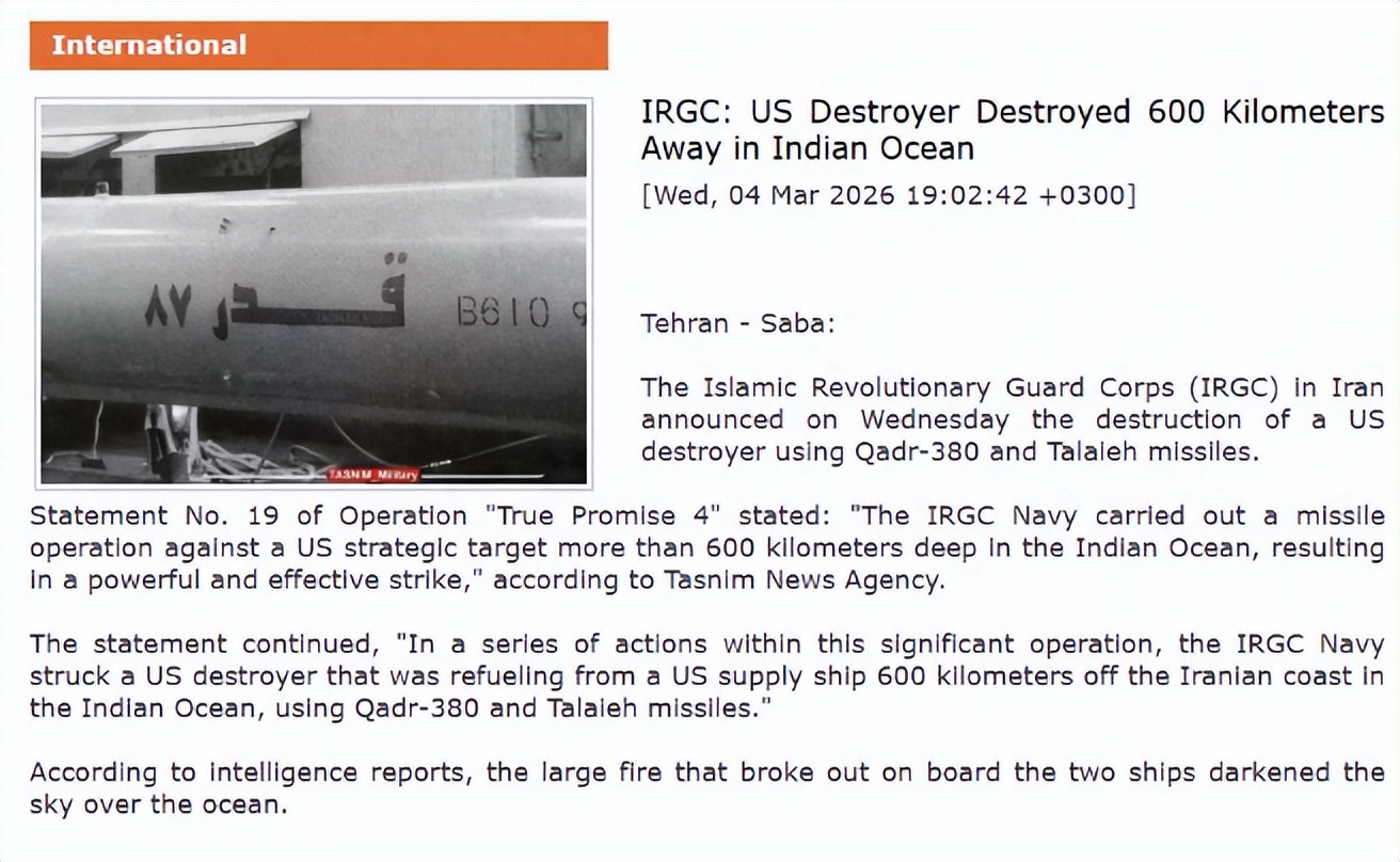 3月4日,伊朗伊斯兰革命卫队发布“真实承诺-4”行动第19号公告,称使用卡德尔-380导弹成功命中了1艘美国海军大型驱逐舰。据推测,这艘军舰可能不是别的型号,而是被称为“21世纪美国海上霸权之基”的“阿利·伯克”级导弹驱逐舰。如果情况属实,这可能是该舰艇在美国海军服役几十年以来,首次在实战中遭遇如此惨重的损失。