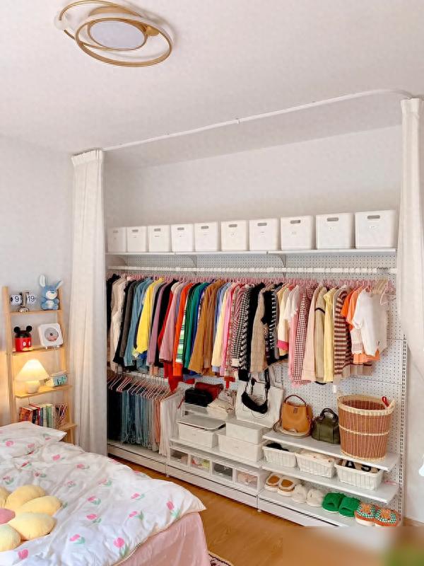 现在她换了金属衣柜:AA柱+金属架+窗帘隔断,一千块做了个1.8米的大衣柜,衣服挂得清清楚楚,找的时候不用翻来翻去,窗帘一拉还能遮灰——没有甲醛,装完就能用,难道不比木质衣柜香?