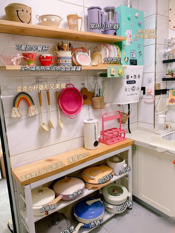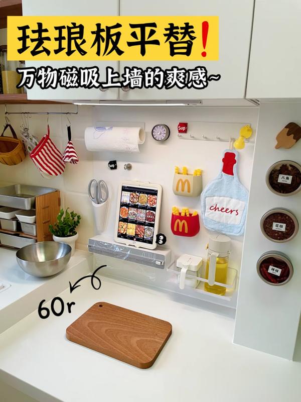 现在换成隔板+珐琅板,隔板放常用的锅碗瓢盆,伸手就够着;珐琅板贴在灶台后面,吸住调料罐、刀架,不用的时候拿下来,擦的时候一喷清洁剂就能擦干净——比吊柜安全还省钱,矮个子女生真的要避开这个“雷”!