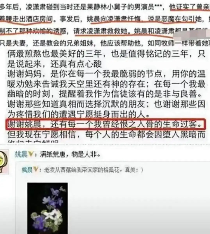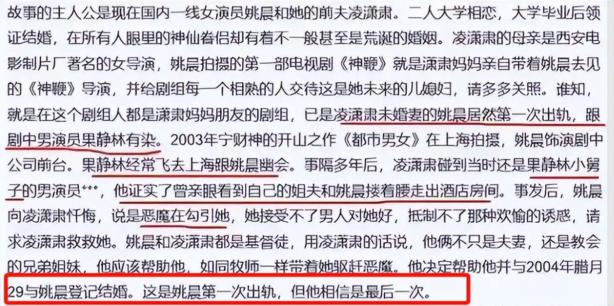 大致意思就是在姚晨跟凌潇肃的那段婚姻中,姚晨经常出轨,并且足足有四次,还有一次直接被凌潇肃撞见从酒店房间走出。