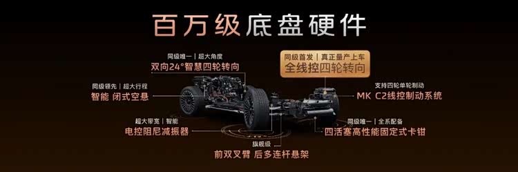 在驾控硬件层面,智己LS8同样不惜成本。前双叉臂+后多连杆悬挂、超大行程闭式空悬、德国大陆MK C2线控制动系统以及一体式四活塞固定卡钳等配置,均为全系标配。