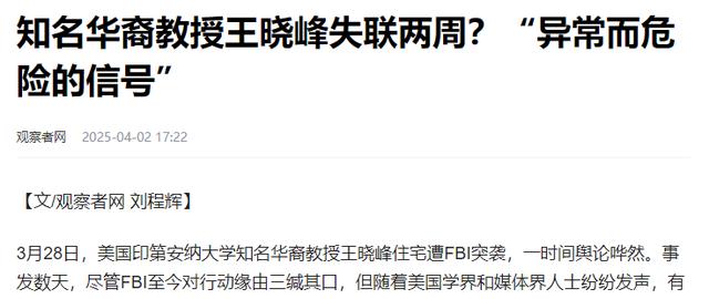 就在学校解雇王晓峰的当天,美国FBI就上门了,对他们的住宅进行了各种锁所调查,搬走了一箱箱的所谓的“证物”,而王晓峰也从那天开始失联。关于为什么调查王晓峰,为什么解雇他们夫妇,无论是学校还是FBI,都没有给出一个合理的解释。