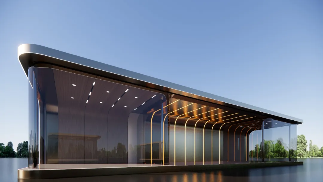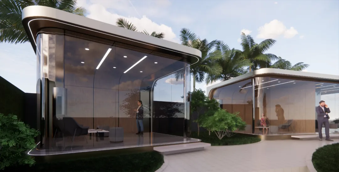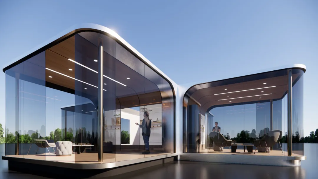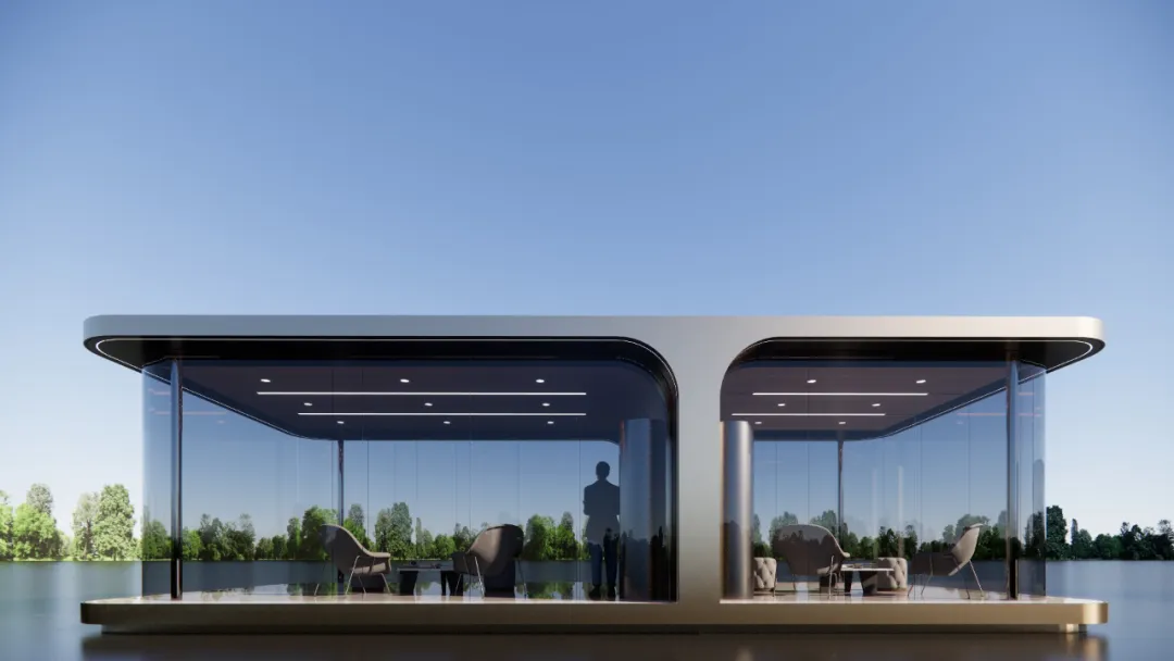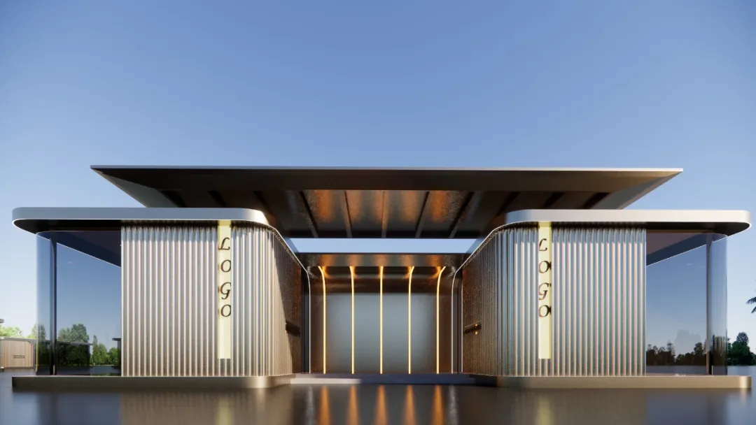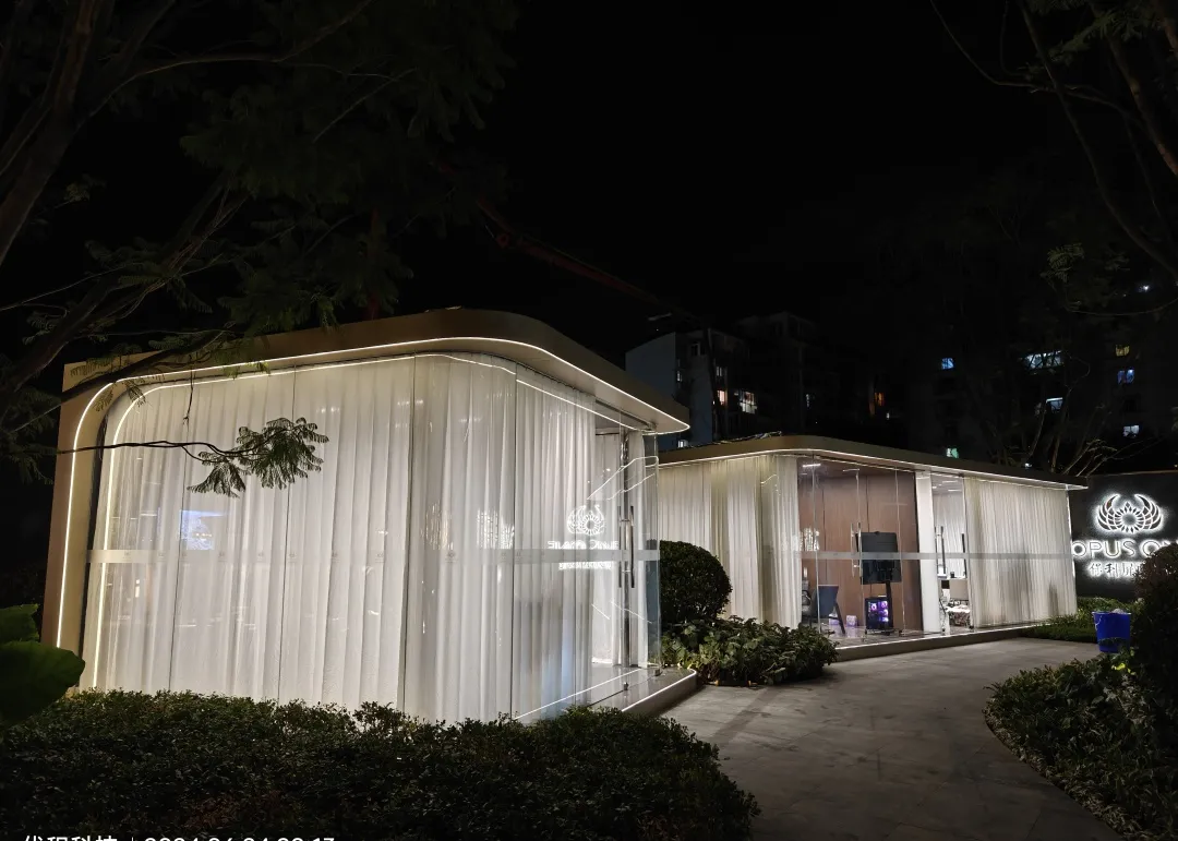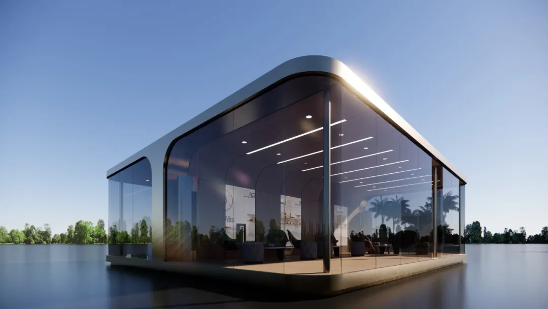 仅用22天,优积科技便完成了曲面屏展示厅设计和施工,展示了其卓越的项目管理和施工能力。采用工厂预制技术,整个建筑在半天内完成现场吊装,体现了现代建筑的高效与精准。外观设计以香槟金色系为主,搭配曲面玻璃幕墙,外围灯带巧妙布局,营造出既独立又和谐的视觉效果。