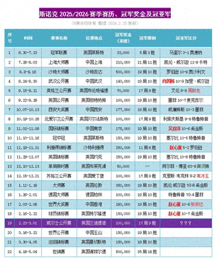 2026年斯诺克威尔士公开赛于2月23日至3月1日在英国兰迪德诺举办。这是2025/2026赛季倒数第四站比赛。目前已进行的18站比赛中,中国球员取得了5冠3亚,其中赵心童背靠背获得了世界大奖赛和球员锦标赛冠军。