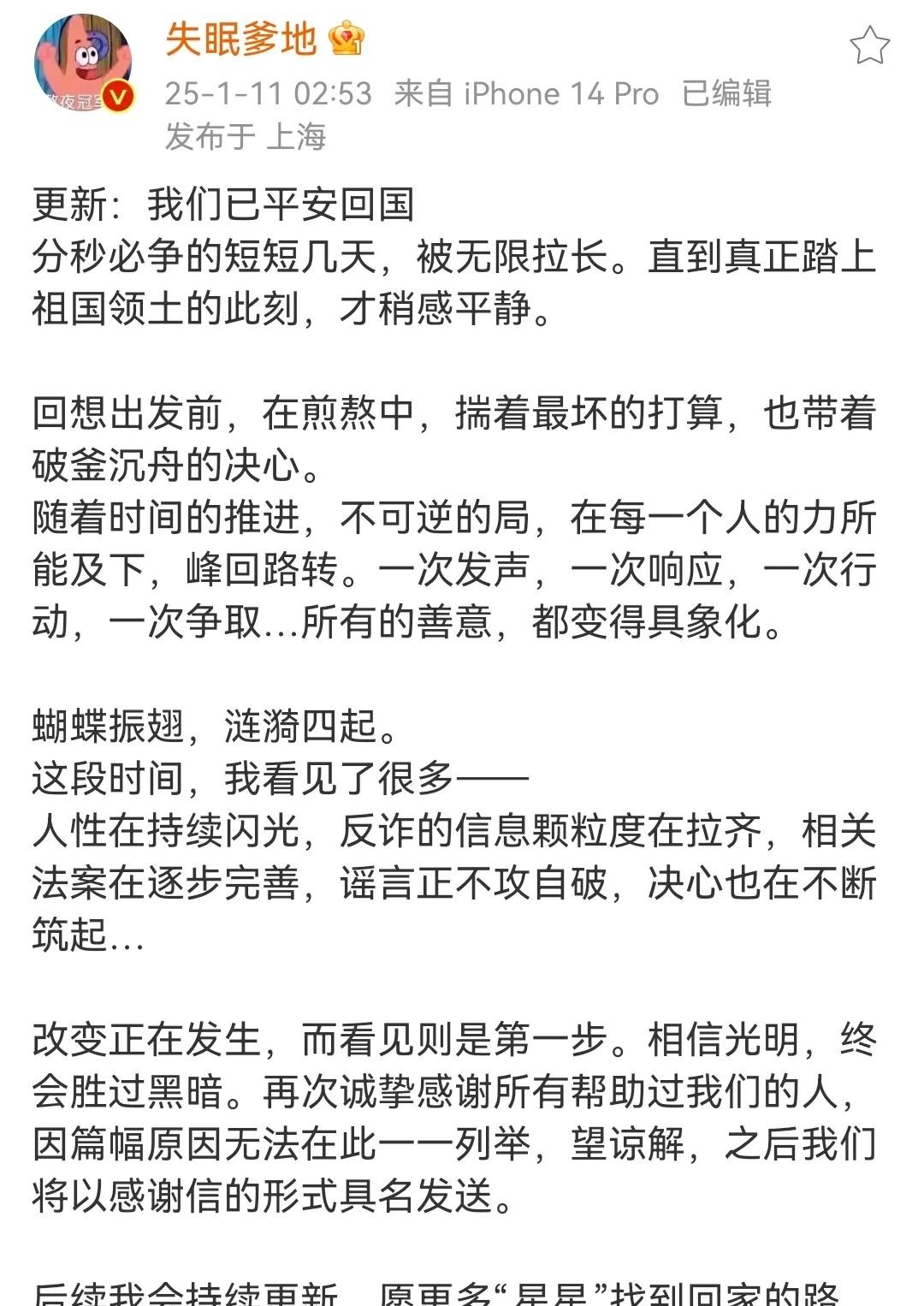 王星回国后,他和嘉嘉的合照,让人感到欣慰。他们紧紧拥抱在一起的那张照片,就是对这段经历最好的注脚。