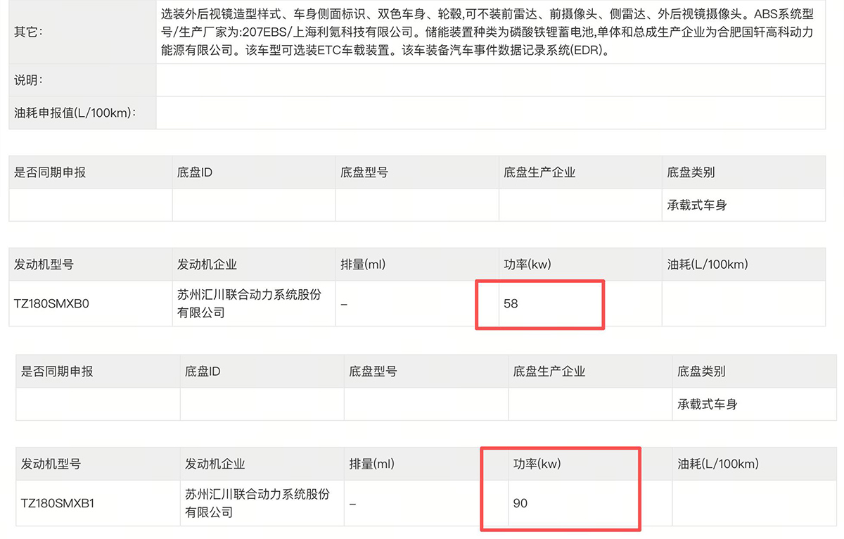 动力部分,根据申报信息显示,新车将会提供两种电机,最大功率分别为58千瓦和90千瓦,匹配的是国轩高科的磷酸铁锂电池组。