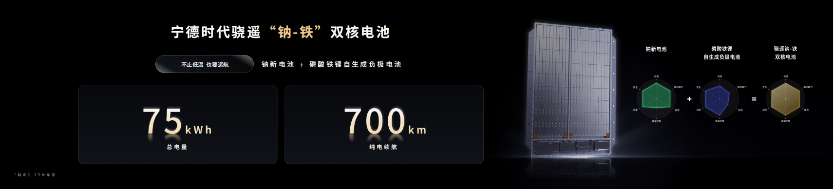 钠-铁双核电池——:钠新电池+磷酸铁锂自生成负极电池,充分利用钠新电池的低温性能,为用户带来不止低温更要远航的极致体验 。