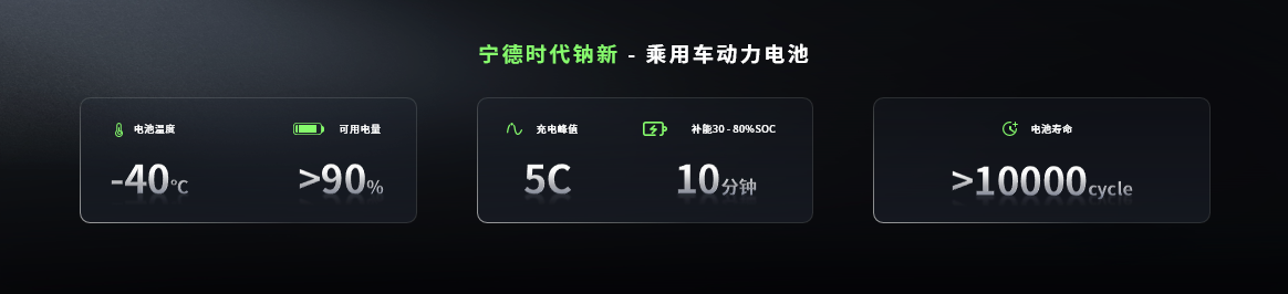 钠新乘用车动力电池的能量密度达175Wh/kg,为当前全球钠电最高,比肩磷酸铁锂电池;支持峰值5C的充电速率和500公里续航,实现超1万个循环的寿命,同时大幅降低维护成本。在安全性上,钠新电池从材料本征层面消除电池热失控中的助燃因素,实现电池安全从"被动防御"到"本质安全"的跨越式突破。