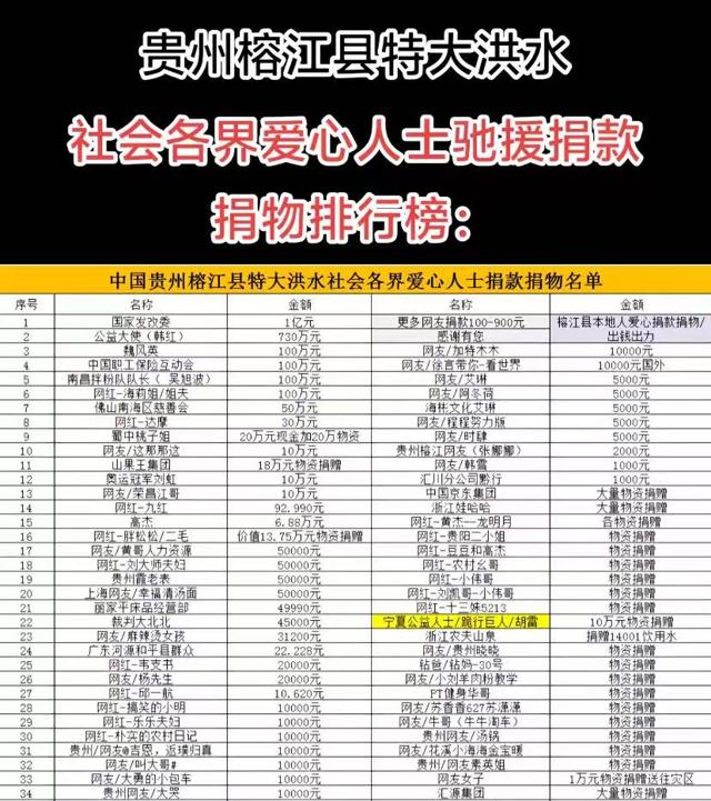中国贵州榕江县特大洪水社会各界爱心人士捐款捐物名单