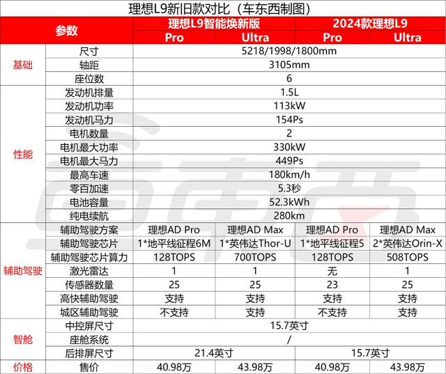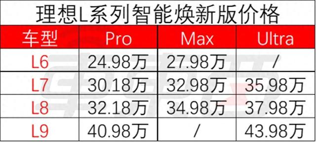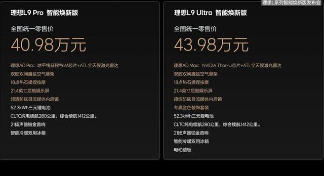 新款理想L9同样是两个版本,售价为40.98万~43.98万元。