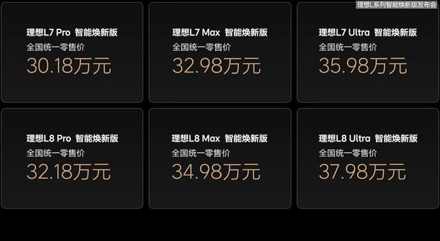 新款理想L7、L8两款车型、三个版本同样保持了价格不变,理想L7售价区间为30.18~35.98万元,理想L8售价区间为32.18~37.98万元。