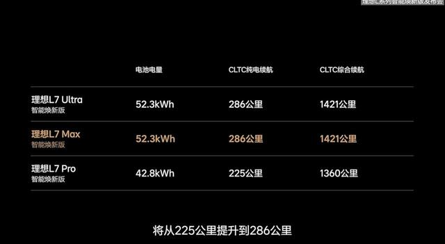 升级后的理想L7 Max,CLTC纯电续航将从225公里提升至286公里,总续航从1360公里提升至1421公里。理想L8 Max的CLTC纯电续航将从225公里提升至280公里,总续航从1360公里提升至1415公里。