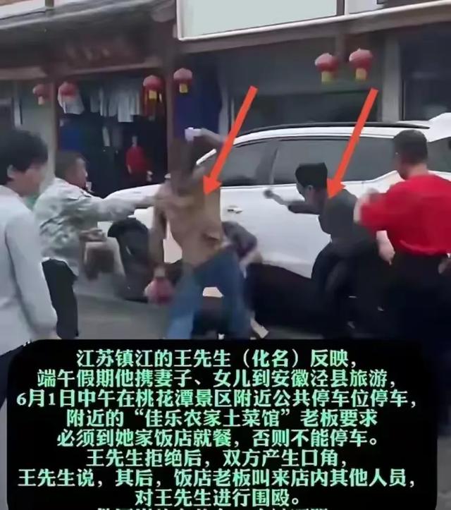 6月1日,正好是六一儿童节,又是端午节小长假,正好一家人出去玩玩。江苏游客王先生一家到安徽泾县游玩,中午王先生一家将车辆停靠在桃花源景区公共停车位上。一家土菜馆要求必须要到他家去吃饭,否则不能把车停在这里。于是,双方发生口角,进而导致饭店5人围殴王先生1人事件。最终报警处理,警方进行了调解,最终饭店补偿王先生500元了事。