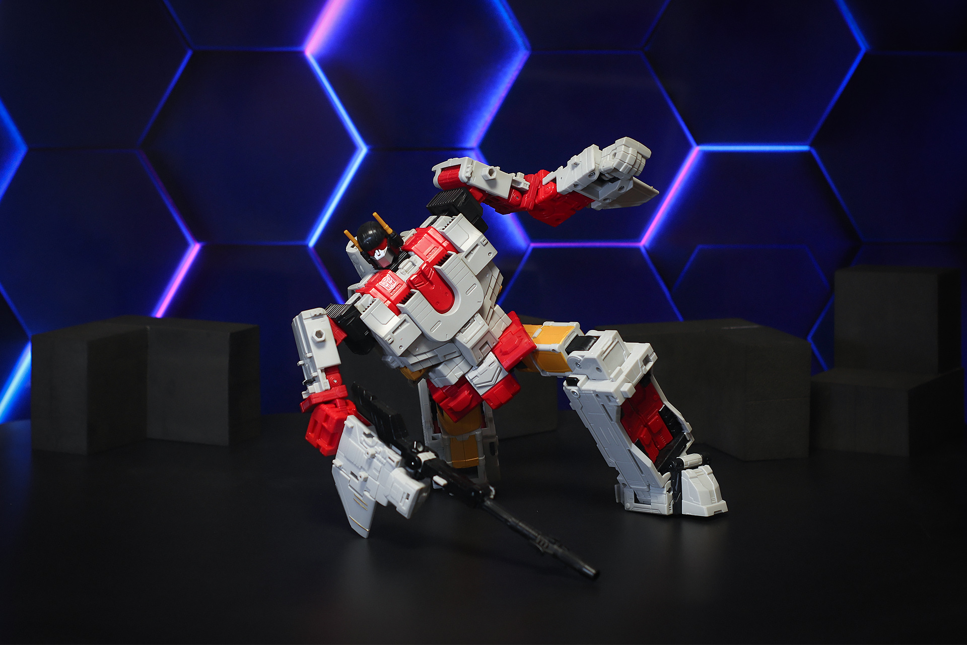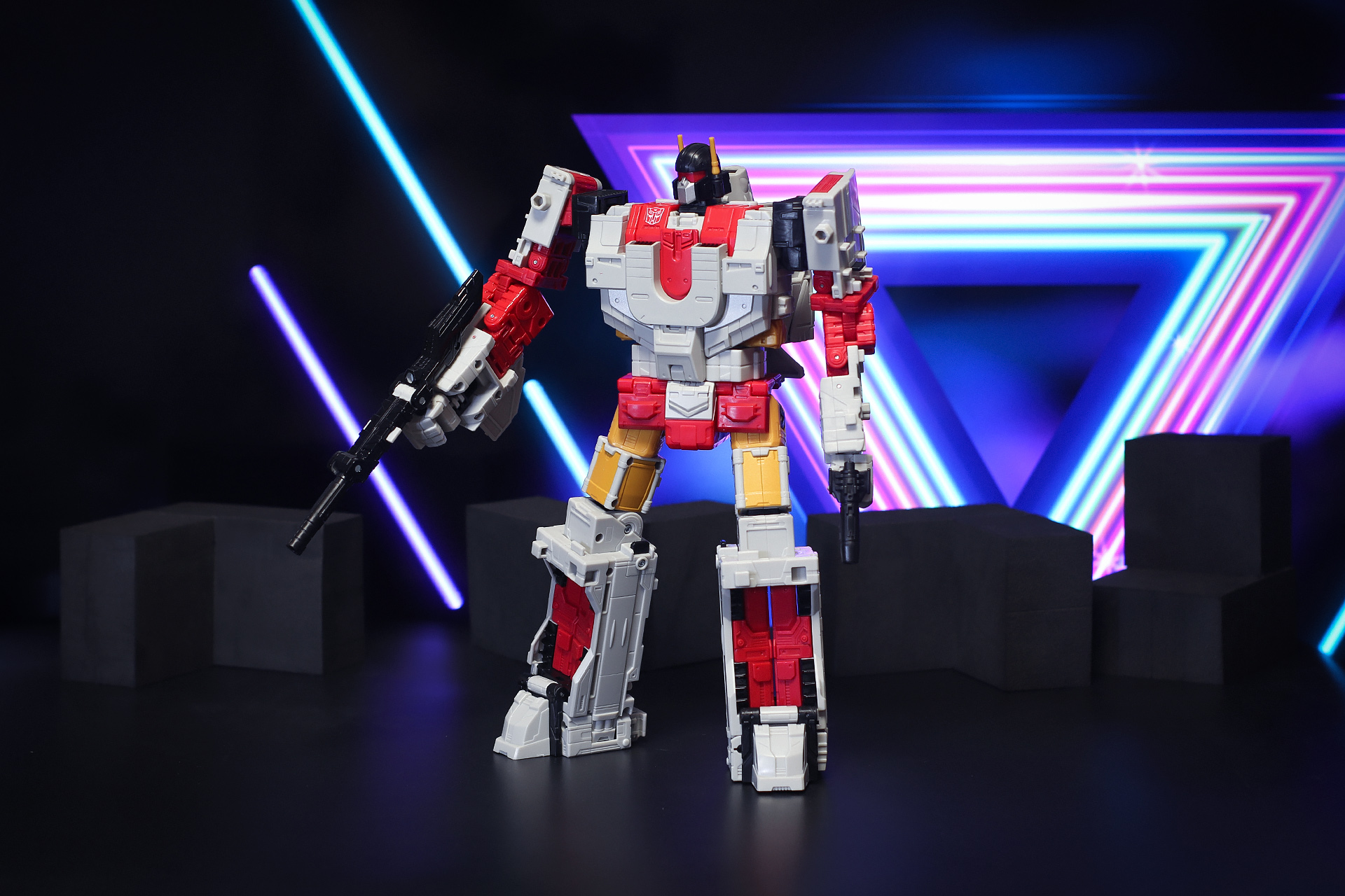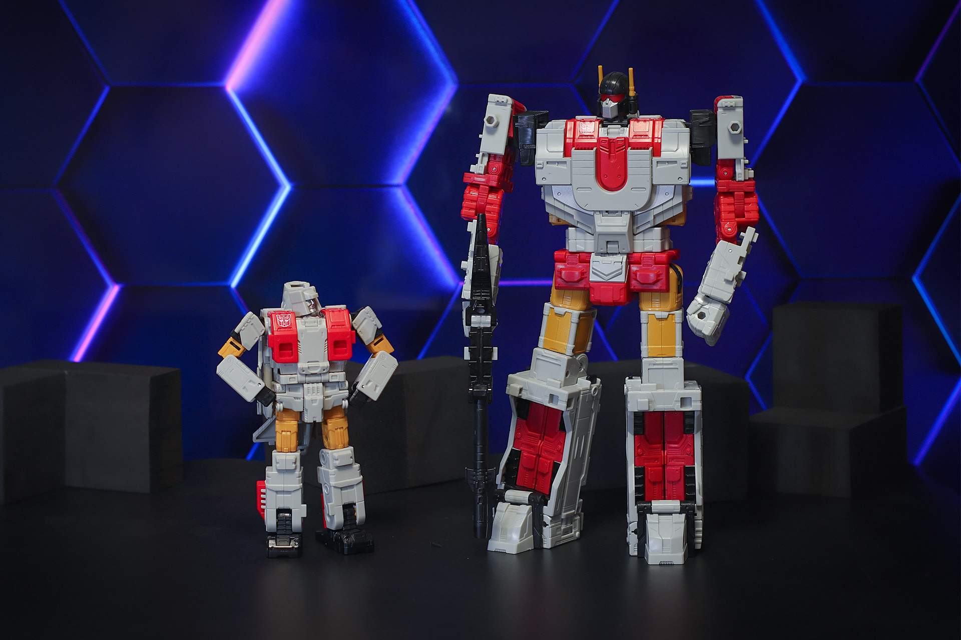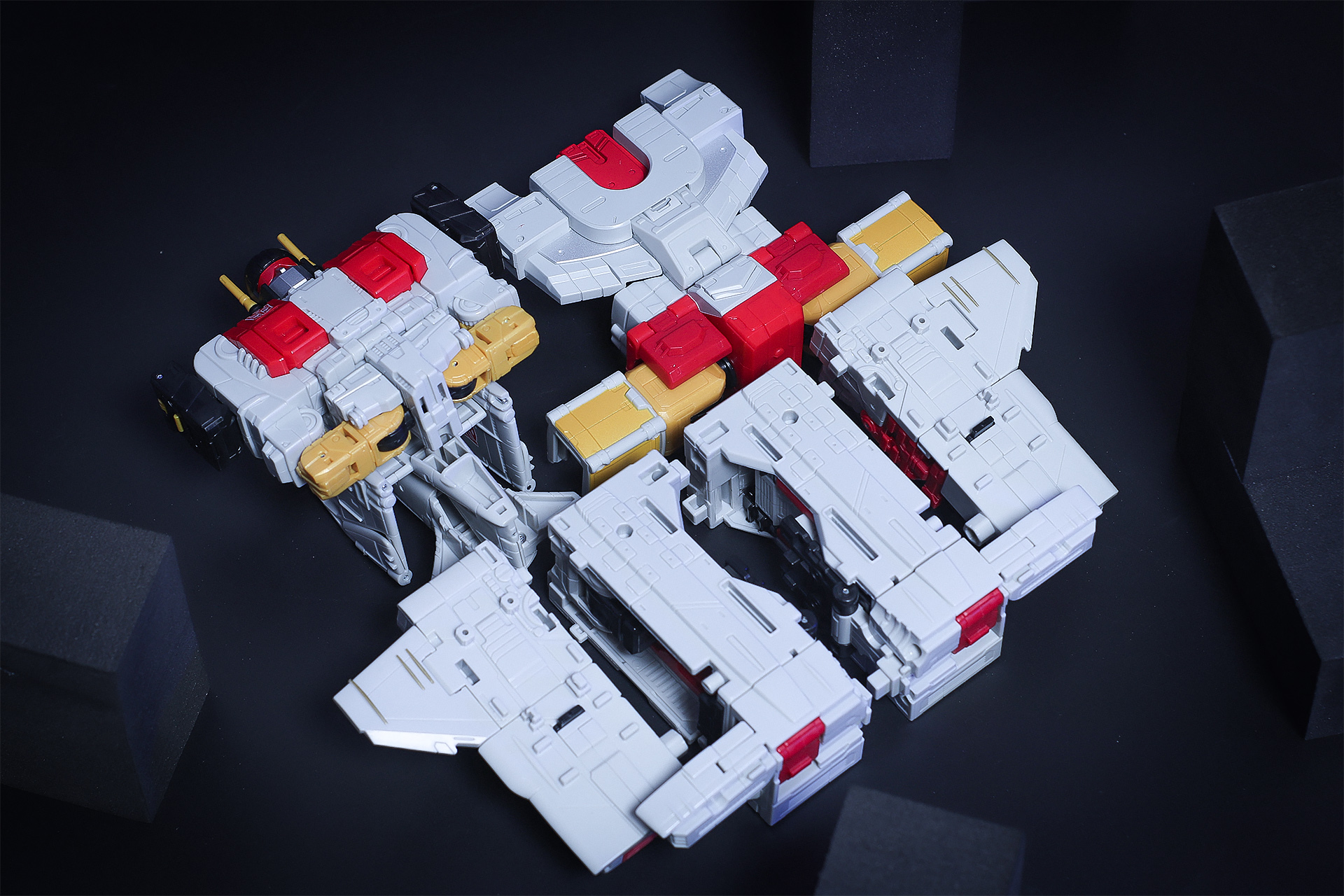 银箭还原回飞机形态时候,不展开翅膀,并且把头从胸甲里替换为大无畏的脑袋,就形成了大无畏的头和躯干主体部分。原先作为炮台的推进器组件拆分开后,可以形成大无畏的腹部和四肢框架。还别说,这组合效果,即便没有四个飞行小队成员来壮硕四肢,高达30cm的身高,在气势上依旧拿捏到位。