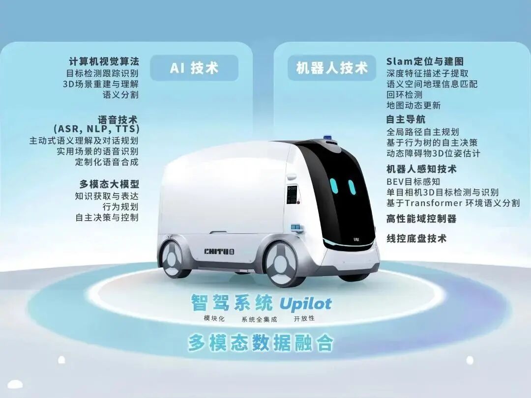 它能精准识别厂房轮廓、道路标志、树木位置这些环境自然特征,再搭配集成了计算机视觉、多模态大模型和 SLAM 定位技术的 Upilot 智能驾驶系统,不仅能 “看见” 环境,更能 “理解” 环境,在复杂的工厂场景里也能做出精准的智能决策。硬件配置也相当硬核,车规级底盘、4 千瓦驱动电机加持下,能实现 25km/h 园区行驶速度、14 度爬坡能力,120 公里续航 + 600 公斤承载 + 3 吨牵引力,重型物料转运也能轻松拿捏。