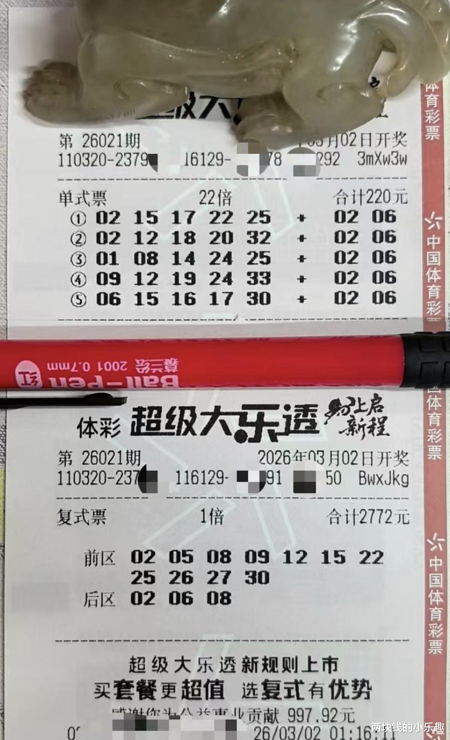 以上就是本期江苏99倍哥贡献的两张票,自然出手又是标配,一张5注22倍和一张11+3的2772复式,这已经是老哥现在的稳定风格了,本期老哥又是研究到凌晨才出票的一期,虽然之前也常常是午夜出票,但本期要更晚一些了,在大多数人早已入睡后,99倍哥依旧为实现自己梦想而努力奋战,可见老哥的决心和毅力是有多么的让人佩服,有意思的是,本期后区全部锁定了02 06 08的全偶姿态,和上期走势基本相似,不过其中02 08是近期出现频率较低的冷门,所以本期又再博冷,不知道本期会不会有所转变!
