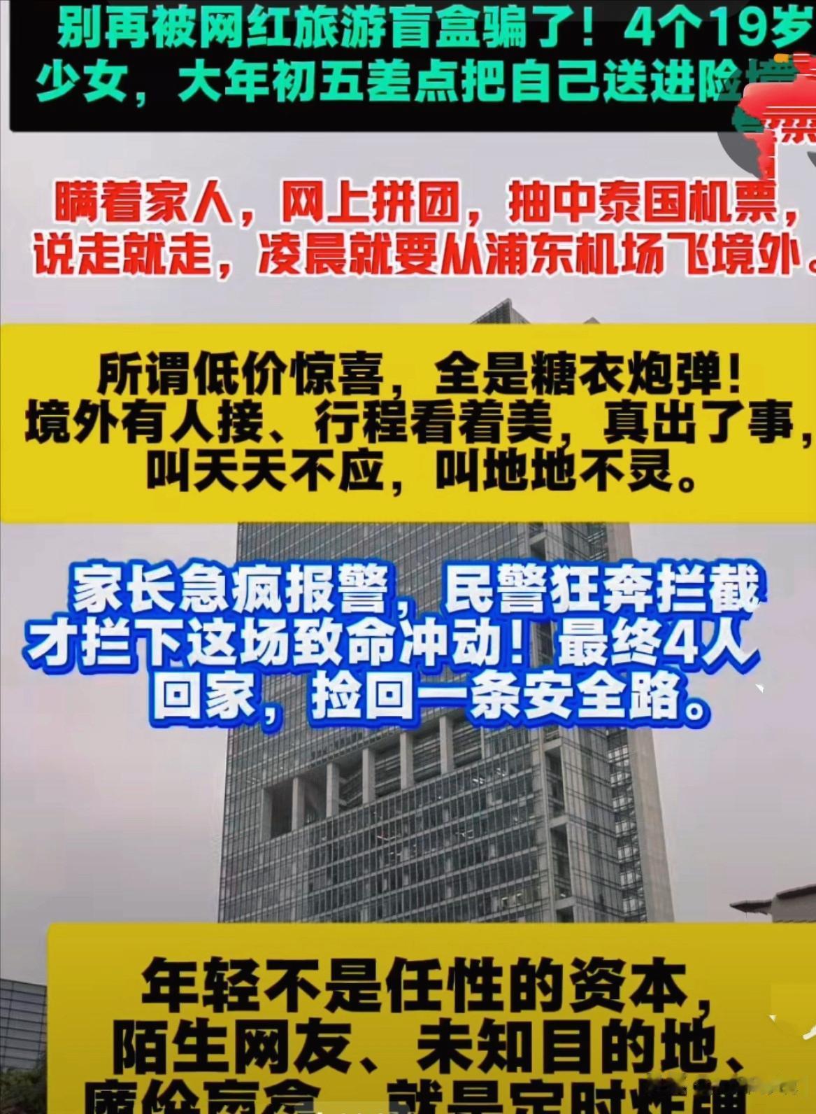 尤其是出国旅行,泰国虽火,可治安环境、法律条款、文化差异,都和国内天差地别。四个刚成年的女孩,没有成年人陪同,没有任何攻略,甚至连同行的“网友”都未必靠谱——去年底,一群女生赴东南亚“打卡”,被骗进传销圈套的新闻,至今历历在目。