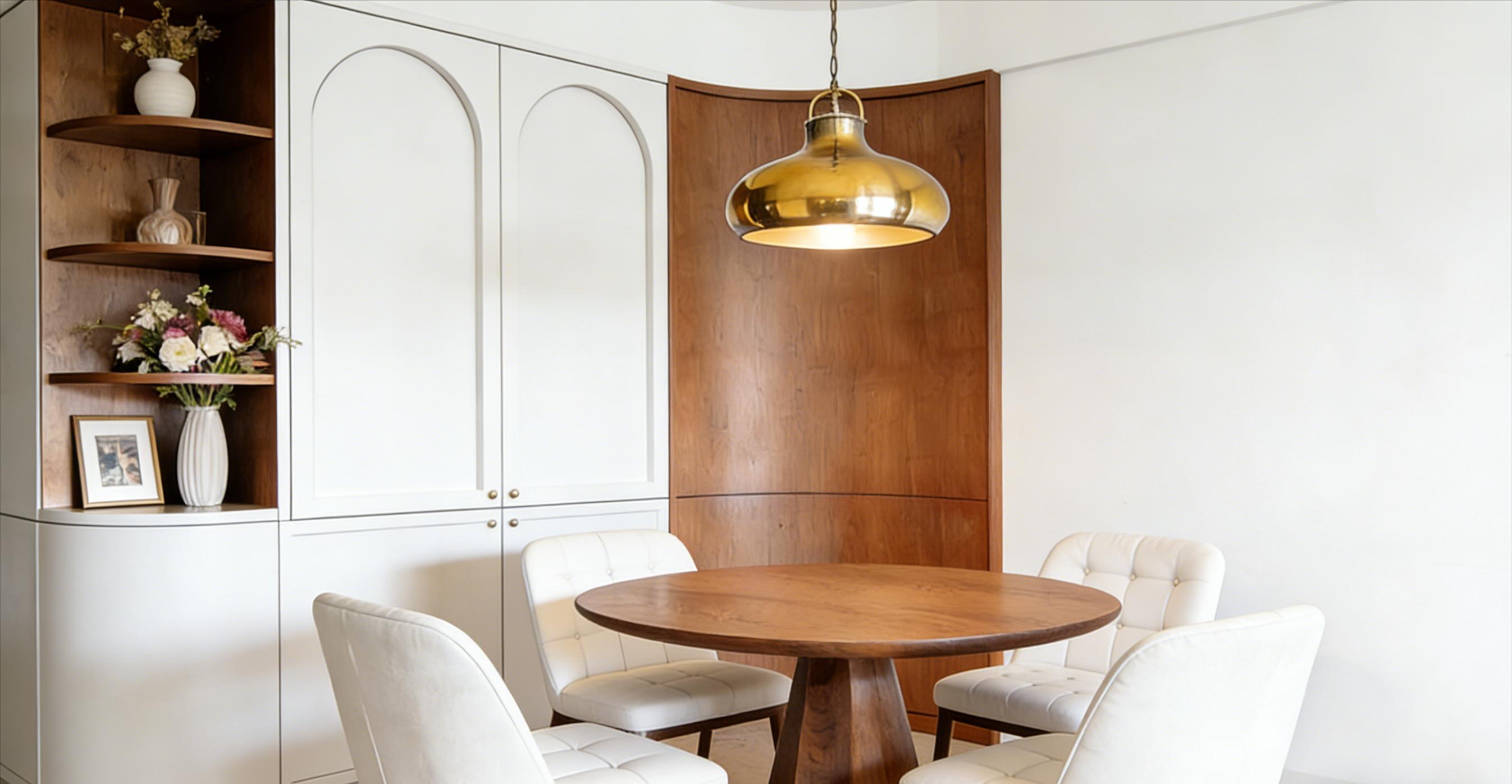 餐厅区域,一张胡桃木圆形餐桌轻盈小巧,适配三口之家日常用餐需求,搭配四把白色软垫餐椅,深浅碰撞提升舒适度。后方未设传统餐边柜,转而设计一组胡桃木转角柜,虚实交错间兼具收纳与装饰功能,柜面嵌入弧形元素,呼应全屋线条设计。上方悬挂一款造型别致的黄铜吊灯,灯光聚焦餐桌,让每一次用餐都成为温馨的仪式。