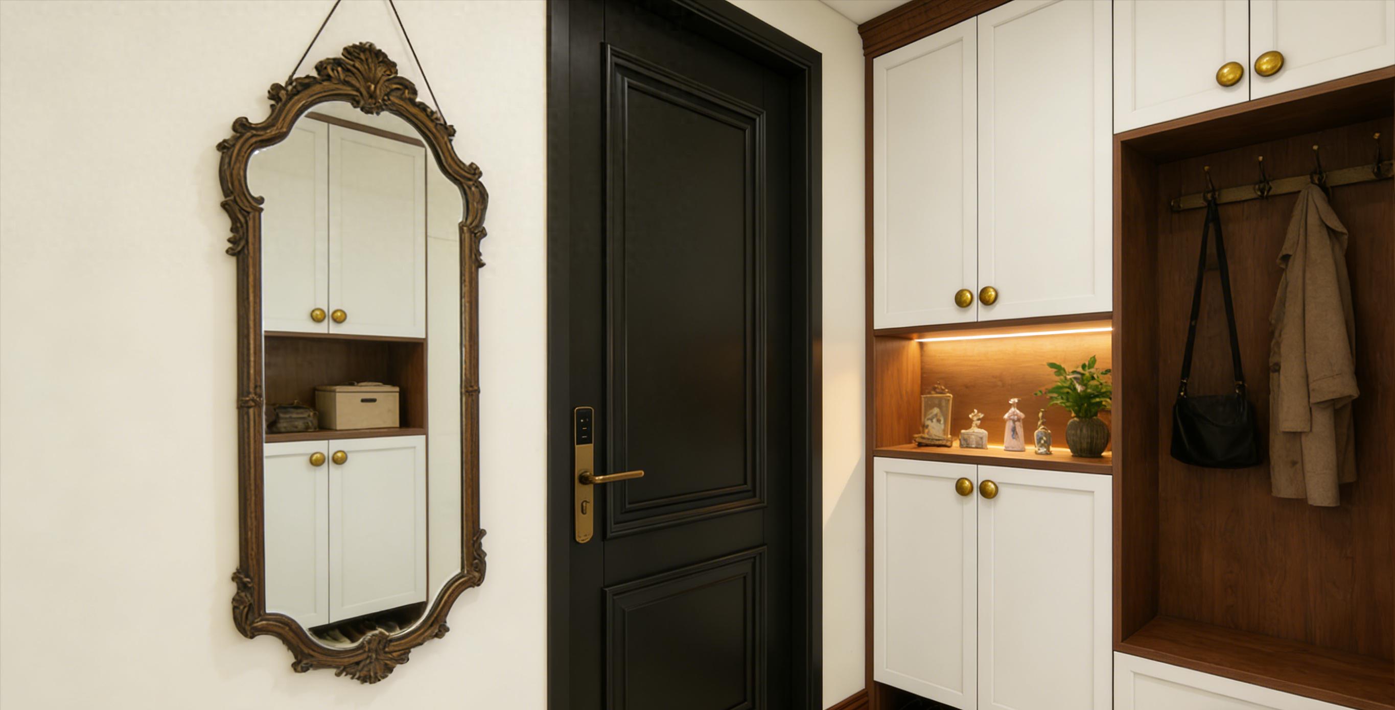 墙面通刷奶油白艺术漆,搭配胡桃色踢脚线,深浅对比间勾勒出空间层次感。一侧悬挂复古穿衣镜,既方便整理仪容,又能反射客厅光线,让狭小玄关更显通透。