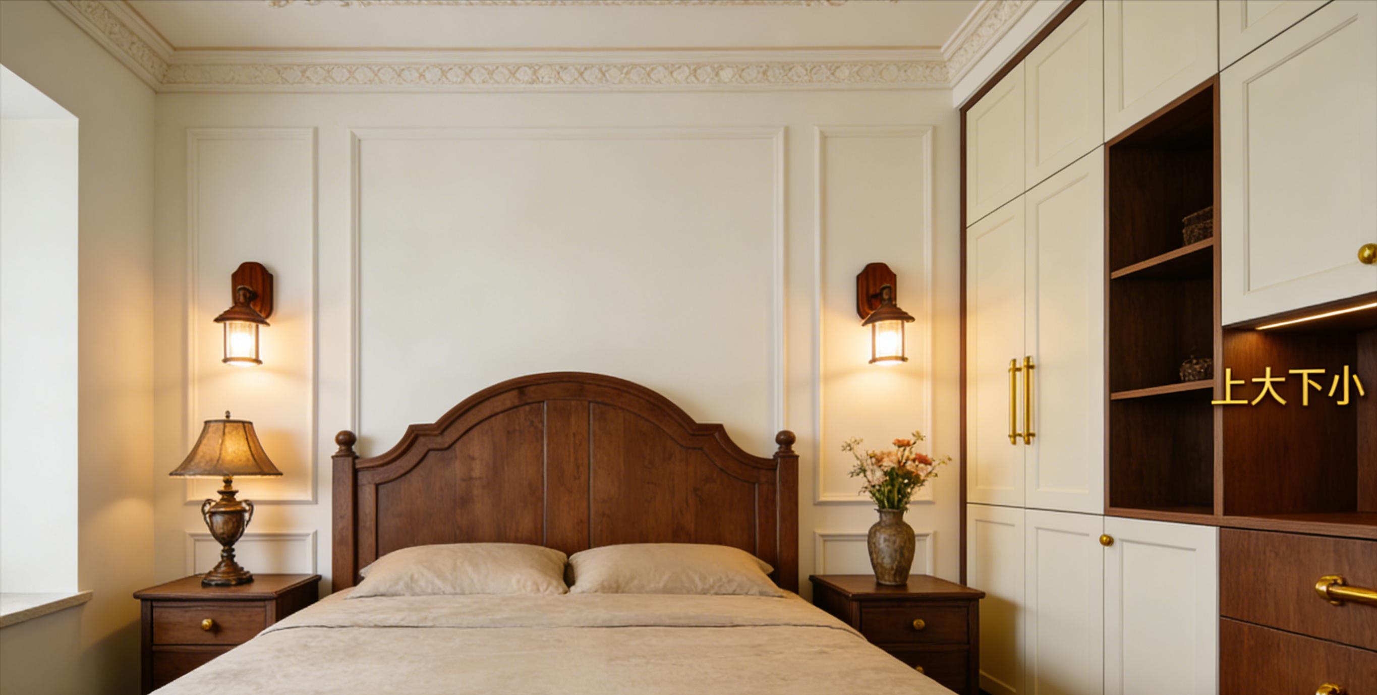 主卧延续整体复古基调,墙面通刷奶油白,天花以石膏线勾勒优雅线条,如同空中舞动的笔触,提升空间精致度。一张胡桃木实木床居于中心,床头两侧搭配胡桃木壁灯,暖光映衬下尽显沉稳温馨。定制衣柜采用“上大下小”功能分区,柜门做奶油白与胡桃木跳色设计,打破单一色调的沉闷,黄铜把手再次呼应复古主题,兼顾颜值与实用性。
