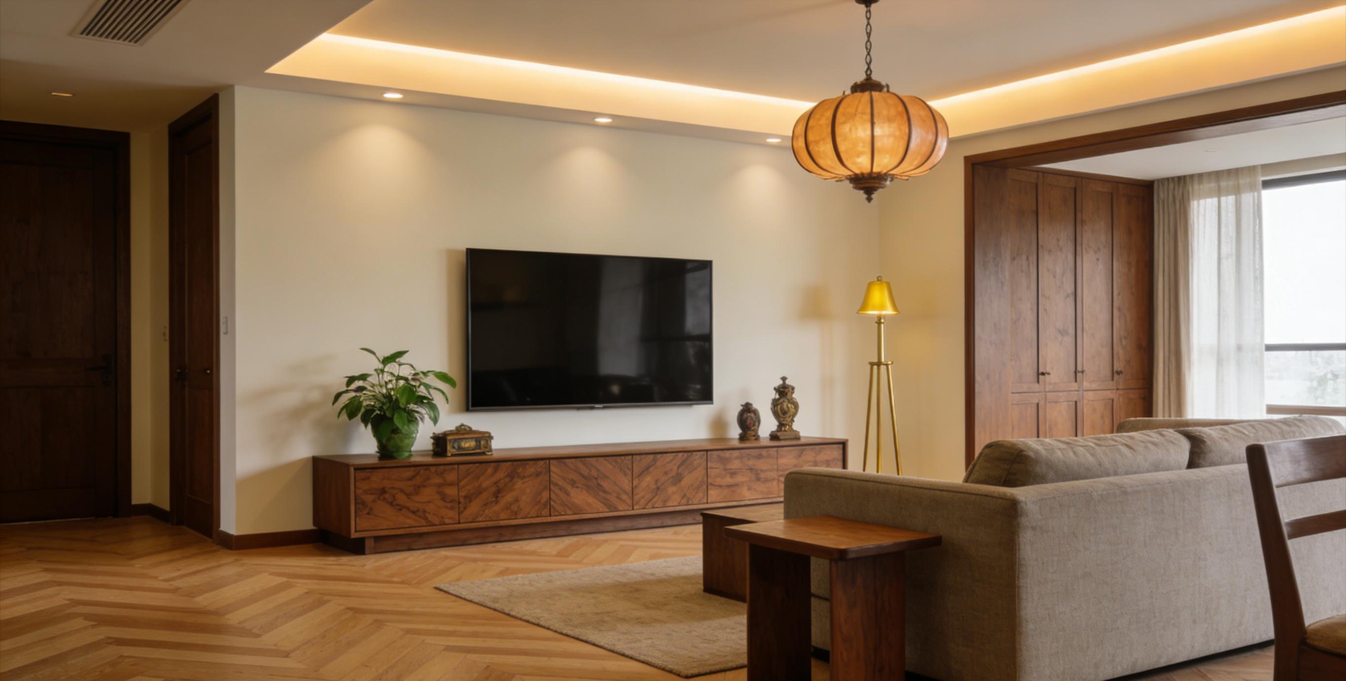 客餐厅作为家庭核心活动区,以胡桃木家具为核心,演绎复古与现代的平衡之美。客厅地面通铺浅胡桃色鱼骨拼地板,天然纹理交错延伸,搭配2700K暖光嵌入式灯带与复古南瓜吊灯,光线柔和漫射,柔化胡桃木的厚重感,营造出慵懒的电影氛围。