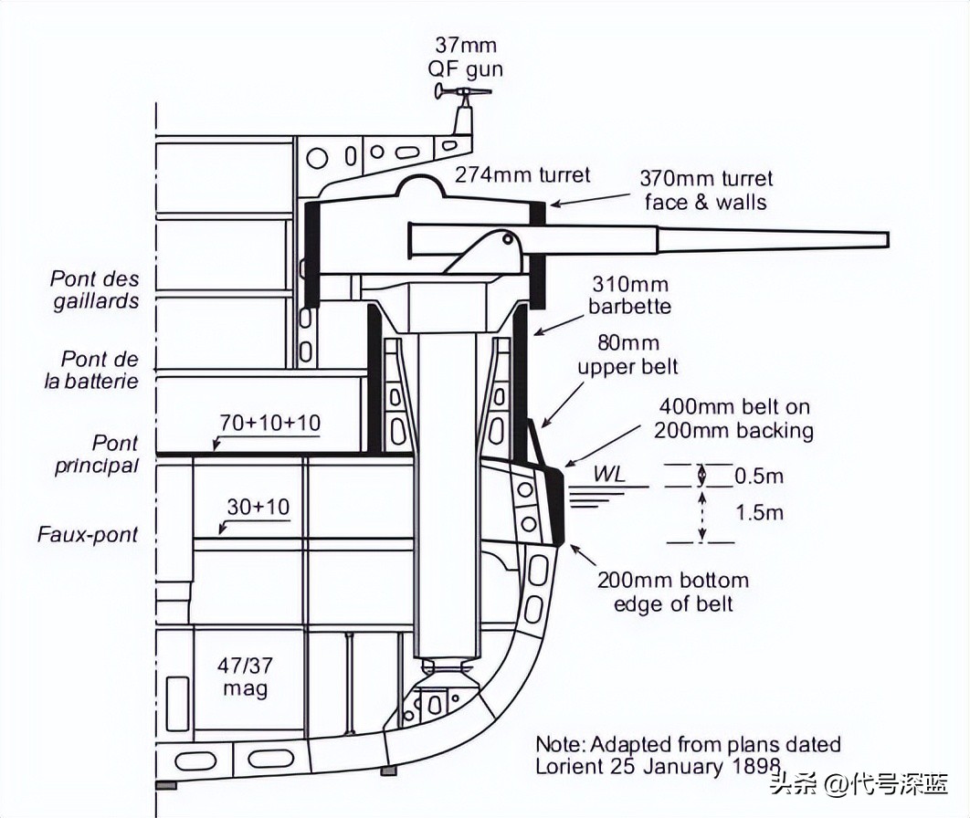 4、装甲防护查理马特级的装甲带采用施耐德公司(Schneider)开发的新型硬化均质钢。舯部装甲带厚度为400毫米,向舰艏递减至300毫米,向舰艉递减至260毫米。装甲板在水线以下部分逐渐减薄:舯部减至200毫米,舰艏舰艉端减至120毫米。装甲带在舯部高度为2米,至舰艉端高度减至1.64米,安装在最大厚度为200毫米的柚木衬垫上。