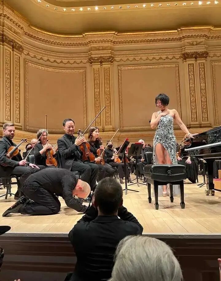 一场音乐会后,指挥家雅尼克竟单膝跪地,向她致敬。